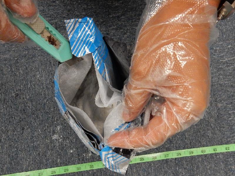 The male passenger arrived at Hong Kong from Johannesburg, South Africa via Dubai, the United Arab Emirates. During Customs clearance, Customs officers found two boxes of food in the plastic bag carried by him exceptionally heavy. In-depth examination led to the discovery of two packets of suspected cocaine contained separately in the two boxes.
