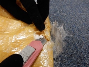 The female passenger arrived at Hong Kong from Manila, the Philippines. During Customs clearance, X-ray check on a suitcase carried by her revealed suspicious images. In-depth examination led to the discovery of a slab of suspected cocaine being concealed inside the false compartment of the suitcase. It is believed that drug traffickers tried to use this concealment method to evade Customs detection.