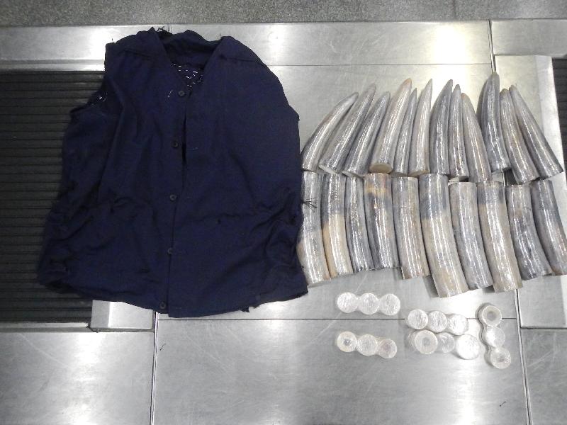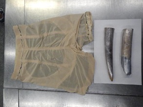 Customs officers intercepted a suspicious male passenger at the airport this morning. The 26-year-old man arrived in Hong Kong from Abuja, Nigeria, via Dubai, United Arab Emirates. During Customs clearance, Customs officers found about 15kg of suspected cut ivory concealed in a tailor-made vest and a pair of underpants inside his check-in luggage and 1kg of suspected cut ivory in his hand luggage.
