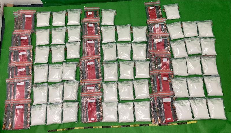 Customs officers yesterday inspected an air consignment, declared as carrying food items, arriving in Hong Kong from Pakistan at HKIA. The batch of suspected ketamine was found concealed inside packages of spices mixed-loaded with other food items in three out of ten carton boxes.