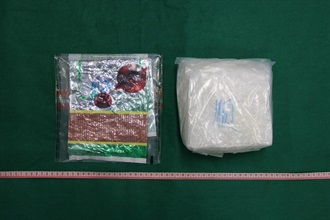 During an anti-narcotics operation conducted in Sheung Shui yesterday afternoon, Customs officers intercepted a 15-year-old male and found that the batch of suspected methamphetamine was concealed inside some tea leaf packaging bags in a suitcase carried by him. The man was then arrested.