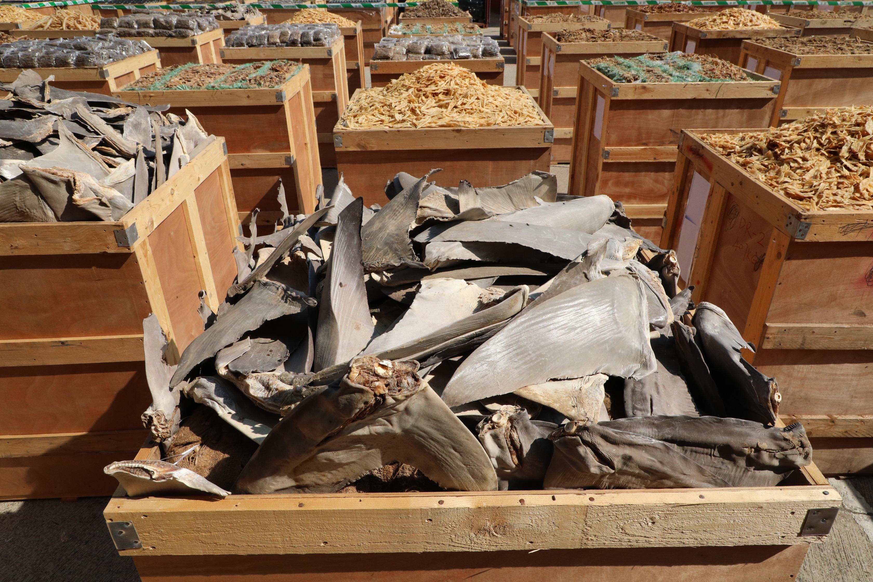 Customs officers identified for inspection eight containers declared as carrying plastic materials and four containers declared as carrying household products on board the two vessels, and found inside nine containers a large batch of suspected smuggled goods, including about 22 tonnes of expensive food ingredients such as dried shark fins, dried fish maws and dried sea cucumbers, over 140 000 electronic goods, about 70 000 pieces of vinyl records, about 9 000 bottles of table wines, about 4 000 boxes of medicine and scheduled endangered species.