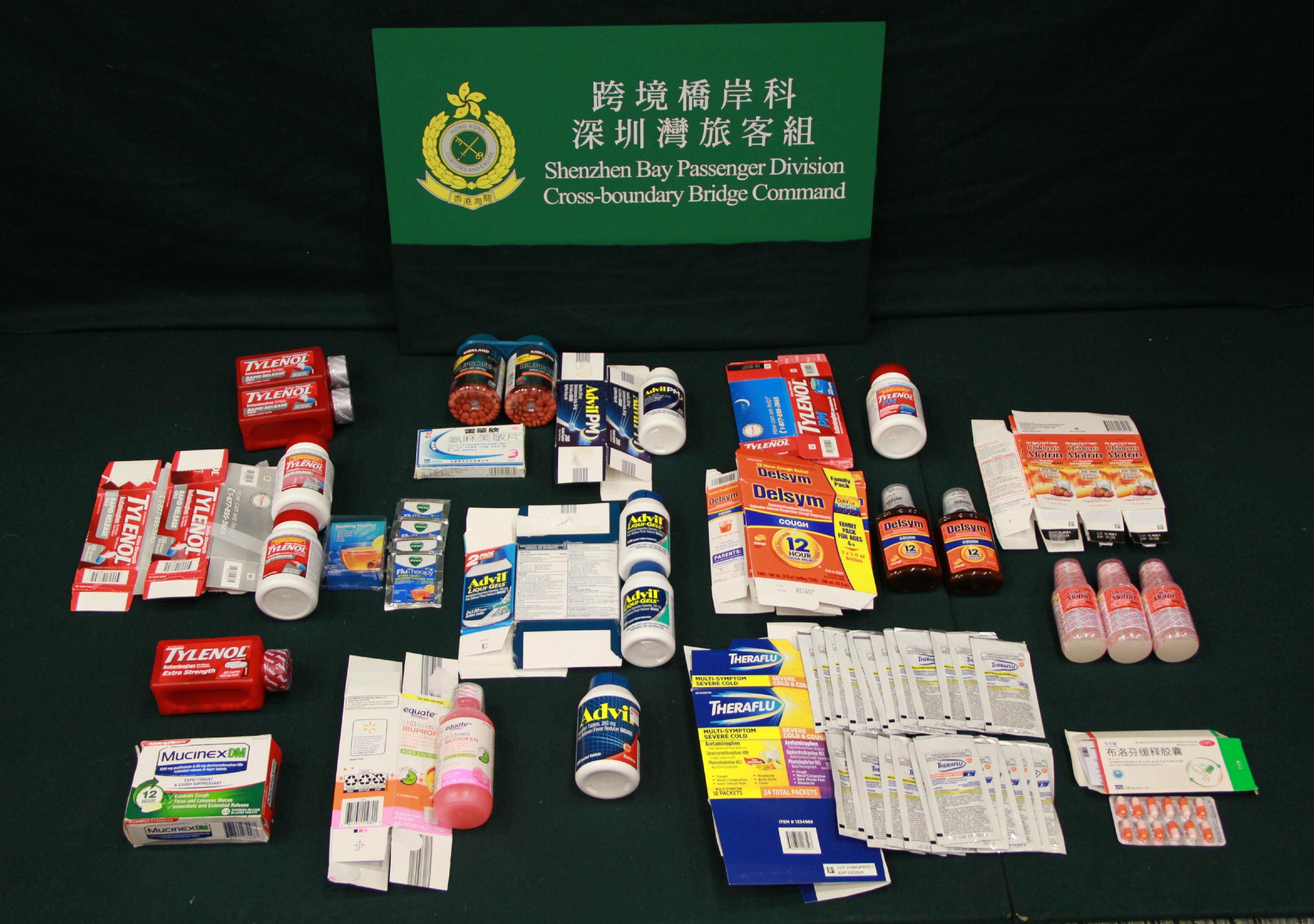 Customs officers yesterday conducted customs clearance on a 60-year-old outgoing male passenger heading to the Mainland. The batch of suspected controlled medicines, mainly including pain and fever relief medicines containing paracetamol or ibuprofen, was seized from his hand-carried baggage. The man was subsequently arrested.