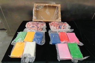Through risk assessment, Customs officers on that day selected a seaborne container, declared as carrying 1 800 carton boxes of frozen chicken feet, arriving in Hong Kong from Brazil for inspection. Upon examination, 300 slabs of suspected cocaine, each weighing about 1kg, were found concealed inside 30 carton boxes of frozen chicken feet. A 67-year-old male truck driver suspected to be connected with the case was arrested at the scene. He was released after subsequent investigation.