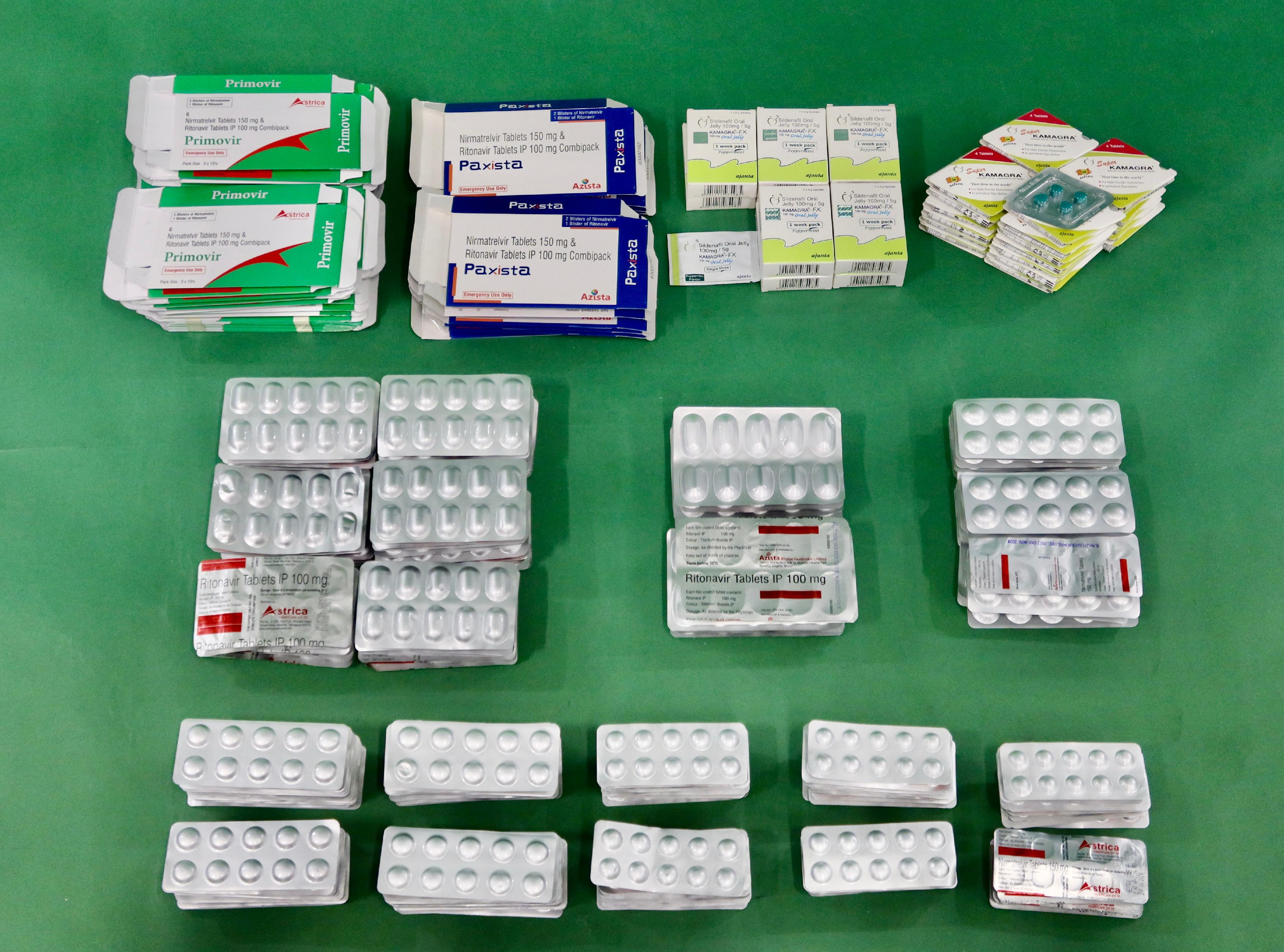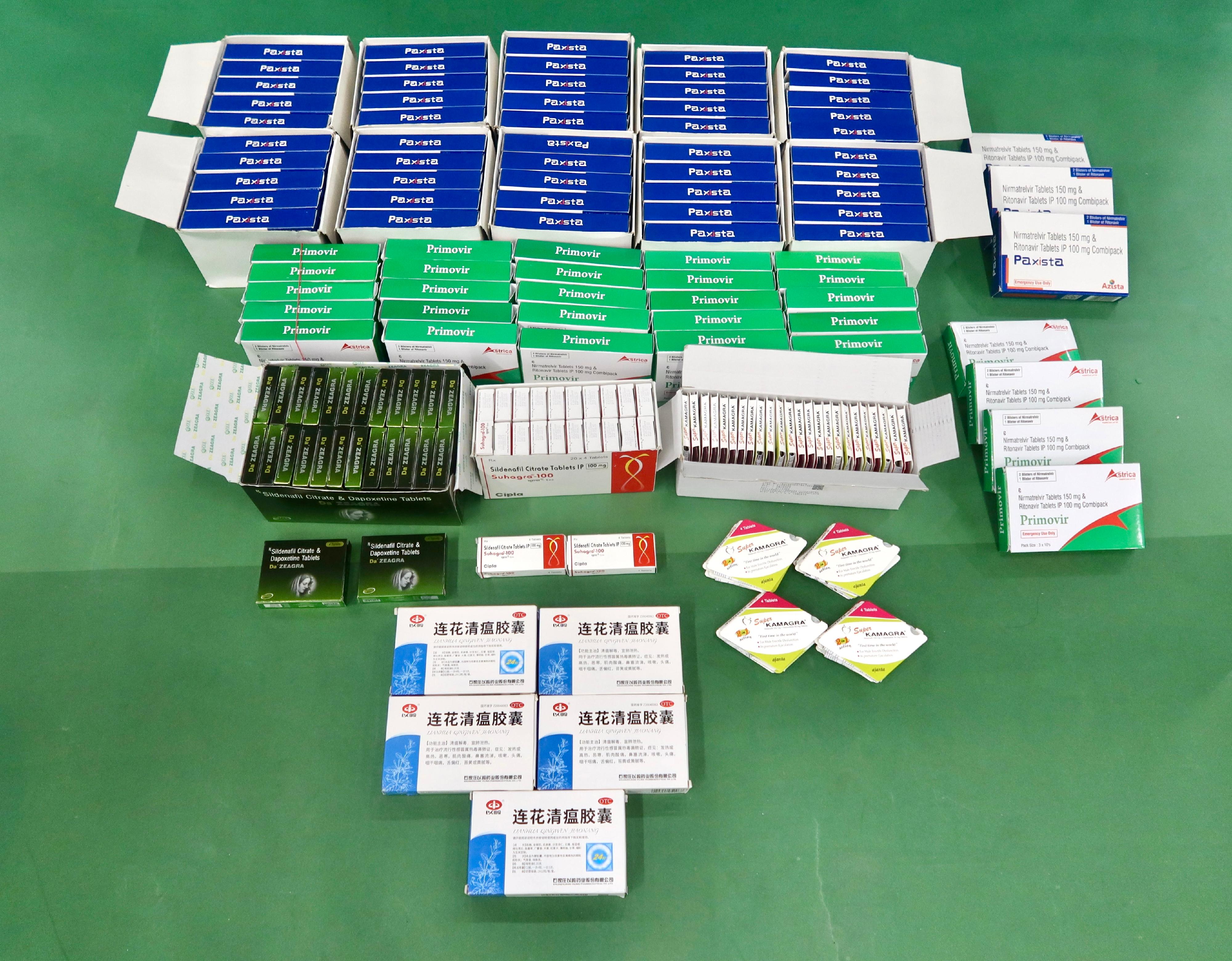 Customs officers on that day conducted customs clearance on three incoming male passengers from India via Thailand at the airport and seized the batch of suspected controlled medicines, including COVID-19 oral drugs and controlled virility products inside their check-in baggages. The three men, aged 32, 34 and 36, were subsequently arrested. Three suspected medicine smuggling cases involving inbound passengers were detected successfully.