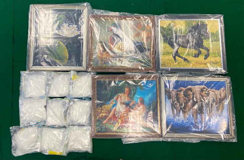 Through risk assessment, Customs officers on that day selected and inspected at the Kwai Chung Customhouse Cargo Examination Compound a seaborne consignment, which was declared as containing oil paintings and had arrived in Hong Kong from Thailand. The batch of suspected methamphetamine was found concealed inside five oil paintings. Upon follow-up investigation, Customs officers today (May 25) arrested a 37-year-old man and a 34-year-old man suspected to be connected with the case in Kam Tin.