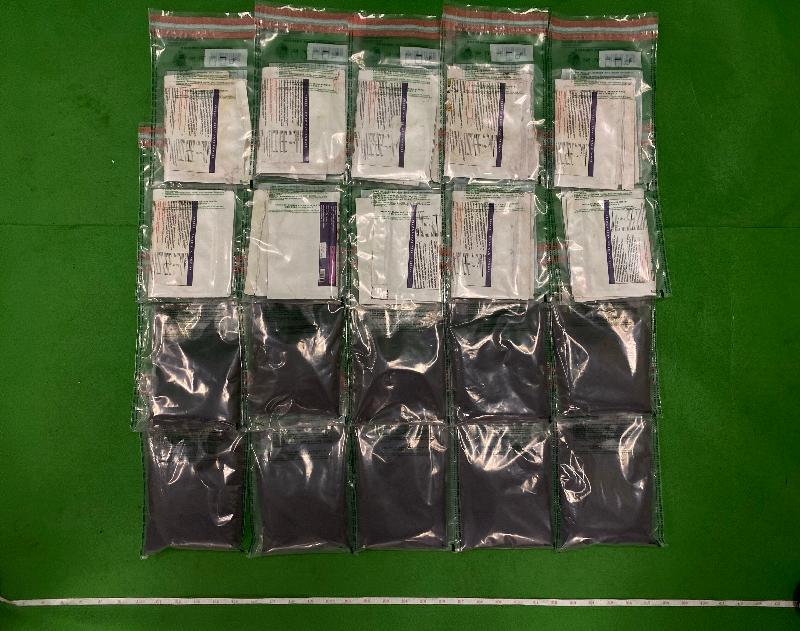 Also, Customs officers on the same day inspected an air postal packet that had arrived in Hong Kong from Brazil at HKIA and found the batch of suspected cocaine concealed inside 10 bags of health food. Upon follow-up investigation, Customs officers yesterday (May 24) arrested a 20-year-old man suspected to be connected with the case in Tsuen Wan.
