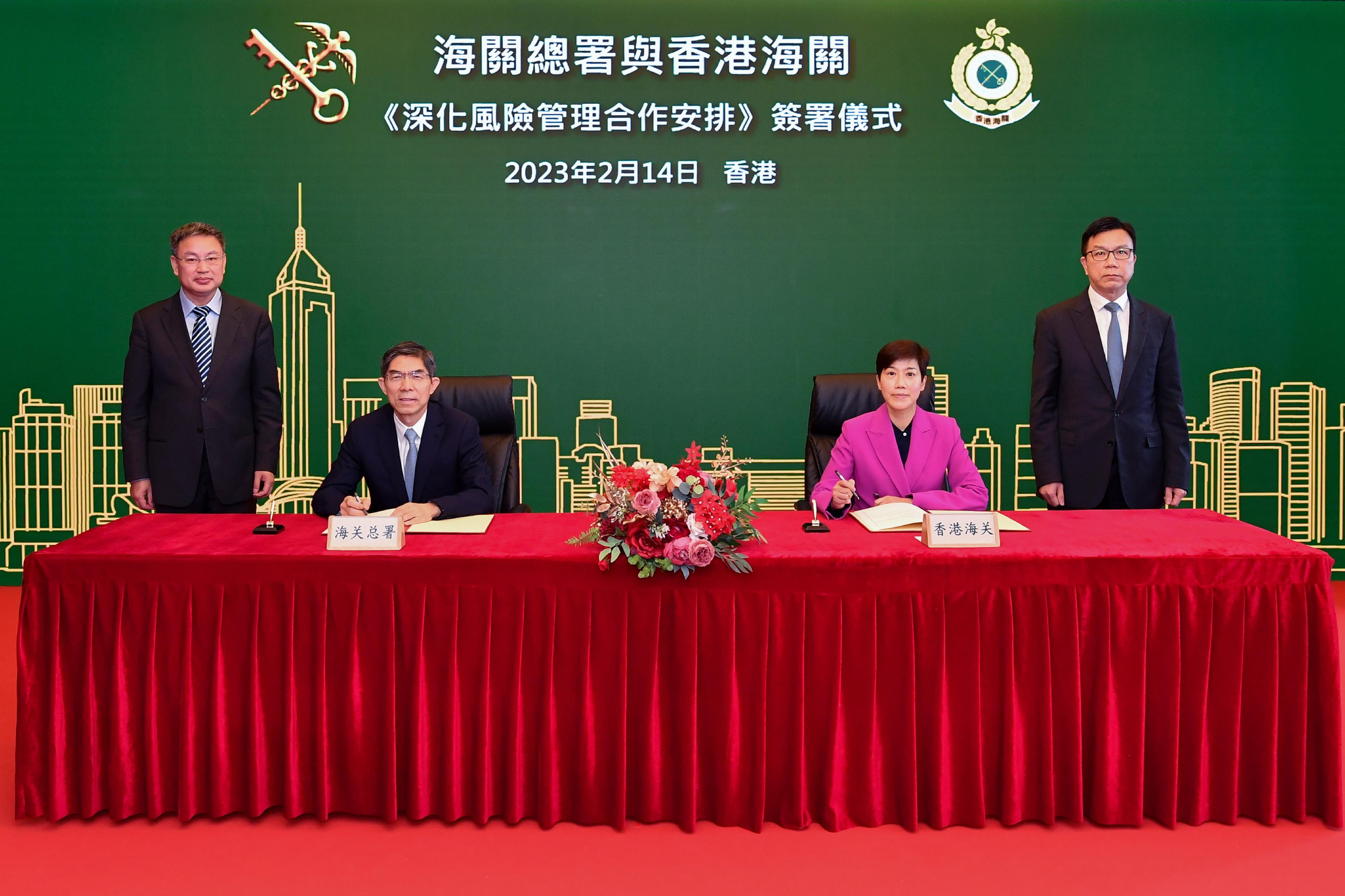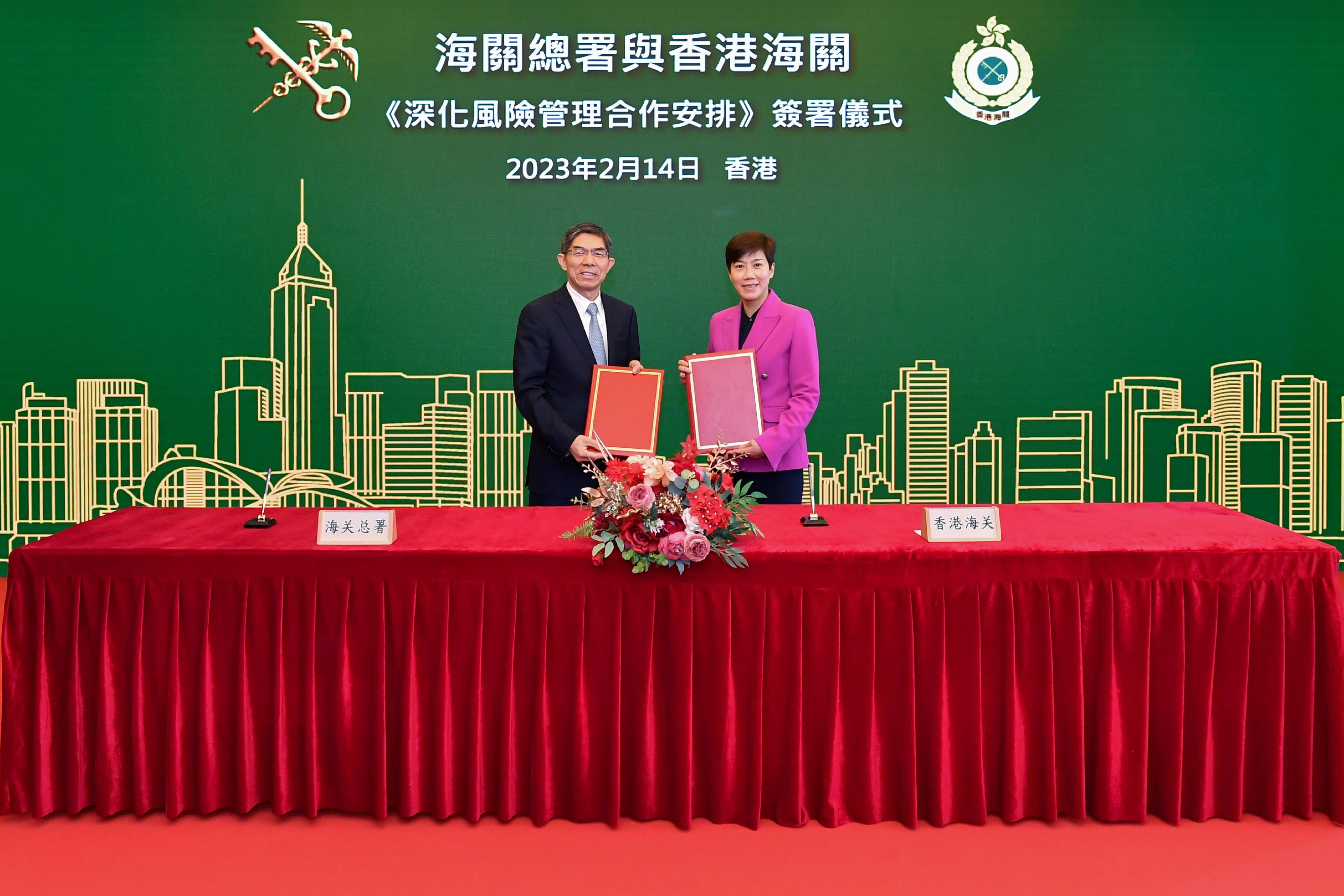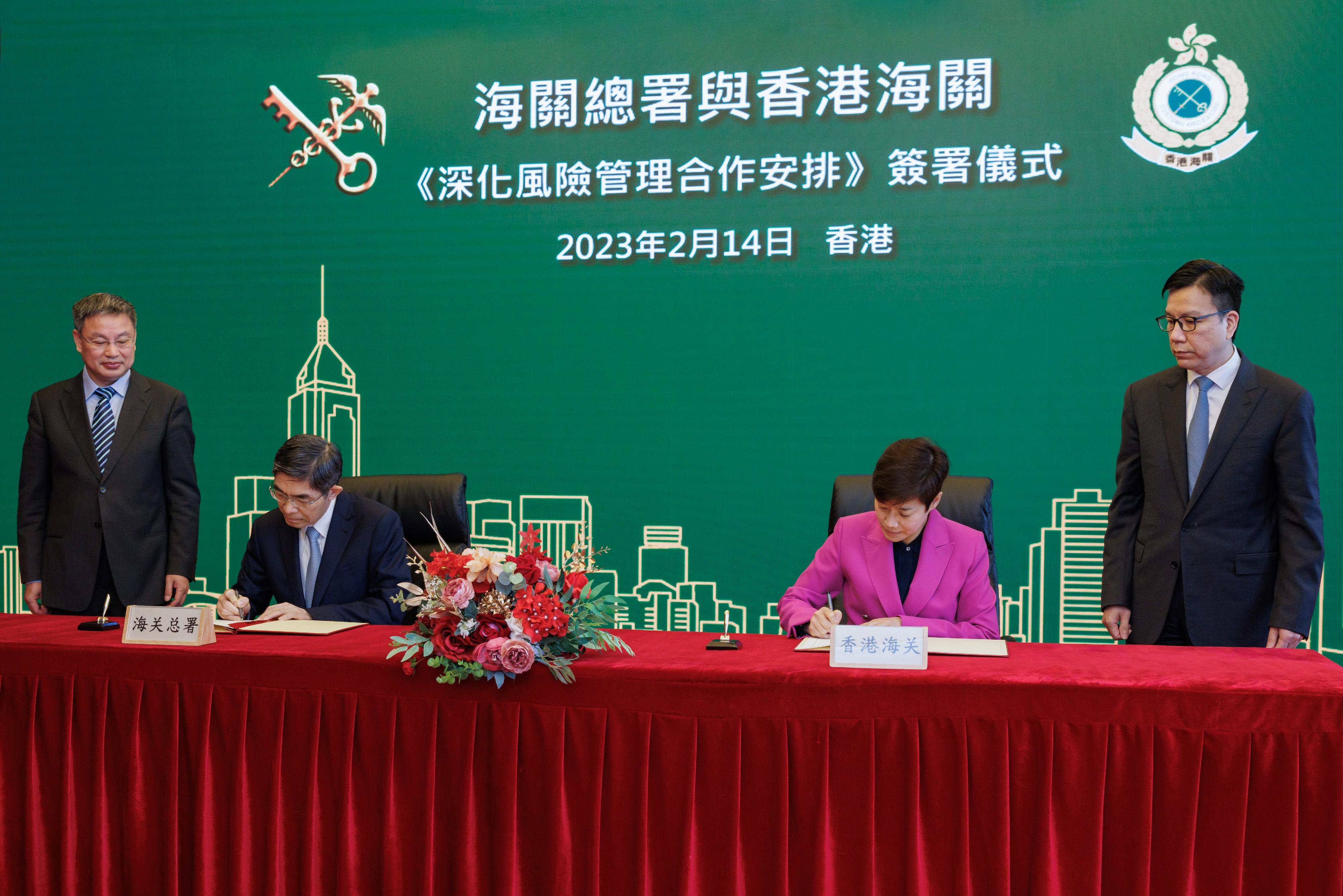 Vice-Minister of General Administration of Customs of the People's Republic of China (GACC) Mr Wang Lingjun and the Commissioner of Customs and Excise, Ms Louise Ho, signed the Co-operative Arrangement on Deepening Risk Management Co-operation between the GACC and Hong Kong Customs (Co-operative Arrangement) in Hong Kong today (February 14).