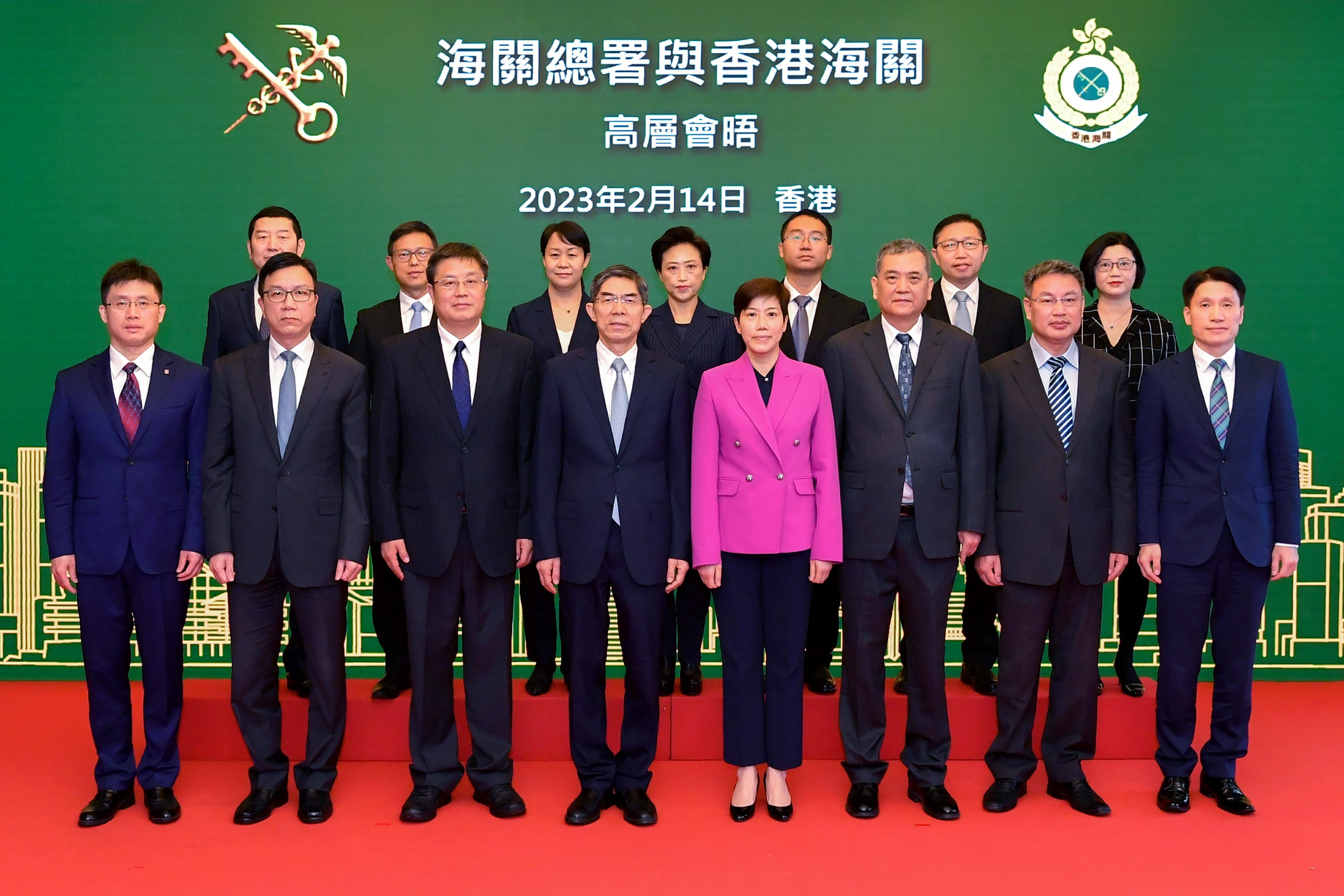 The Commissioner of Customs and Excise, Ms Louise Ho (front row, fourth right), and the Vice-Minister of General Administration of Customs of the People’s Republic of China (GACC), Mr Wang Lingjun (front row, fourth left), signed the Co-operative Arrangement on Deepening Risk Management Co-operation between the GACC and Hong Kong Customs in Hong Kong today (February 14). Other guests attending the signing ceremony include the Deputy Director General of the Department of Finance of the GACC, Mr Xu Mingjie (front row, first left), the Director General of the Department of Commodity Inspection of the GACC, Mr Lin Jian-tian (front row, third left), the Chief Engineer of the GACC, Mr Li Wenjian (front row, third right), the Director General of the Department of International Cooperation of the GACC, Mr Zhou Wenyi (front row, second right), the Director of Customs Liaison Division, Police Liaison Department, Liaison Office of the Central People's Government in the Hong Kong Special Administrative Region, Mr Qi Hao (back row, first left), the Director of the Office of Hong Kong, Macao and Taiwan Affairs of the GACC, Ms Zhuang Yan (back row, third left) , the Deputy Director of the General Office of the GACC, Mr Jiang Zhitao (back row, third right) and other senior officials of the Hong Kong Customs.
