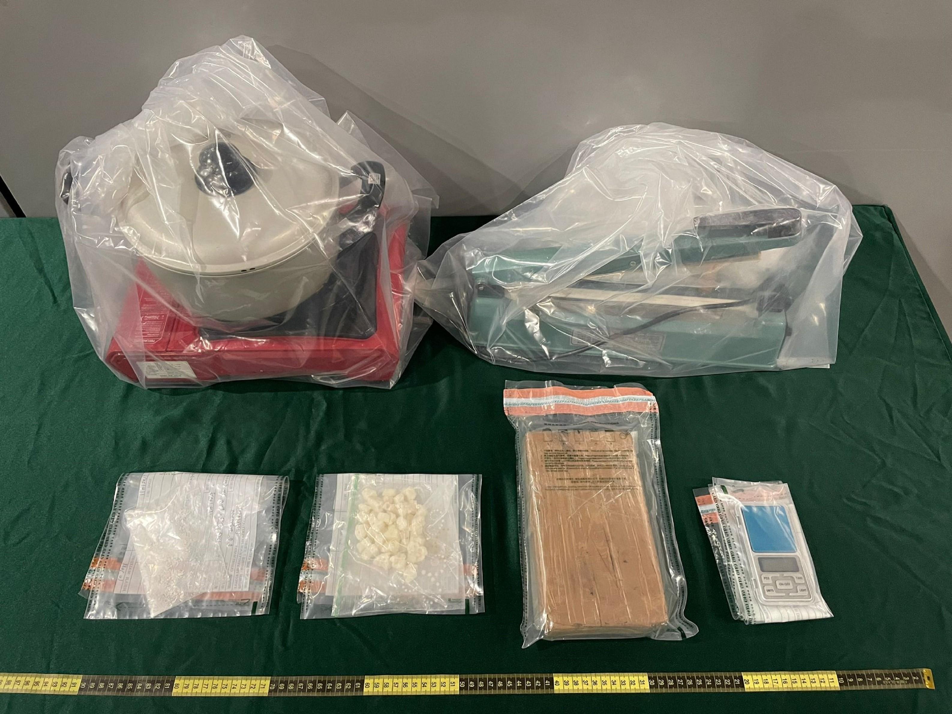 Customs officers later escorted the arrested man to a residential premises nearby for a search and further seized about 60g of suspected crack cocaine and a batch of drug manufacturing and packaging paraphernalia.