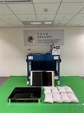 In the second case, through intelligence analysis and in-depth investigation, Customs officers on April 16 inspected an air cargo consignment, declared as carrying thermoforming machines, arriving from Mexico en route to Australia via Hong Kong at the airport. Upon inspection, Customs officers found about 45kg of suspected methamphetamine concealed inside false compartments inside the thermoforming machine. The estimated market value of the suspected methamphetamine is about $28.5 million.