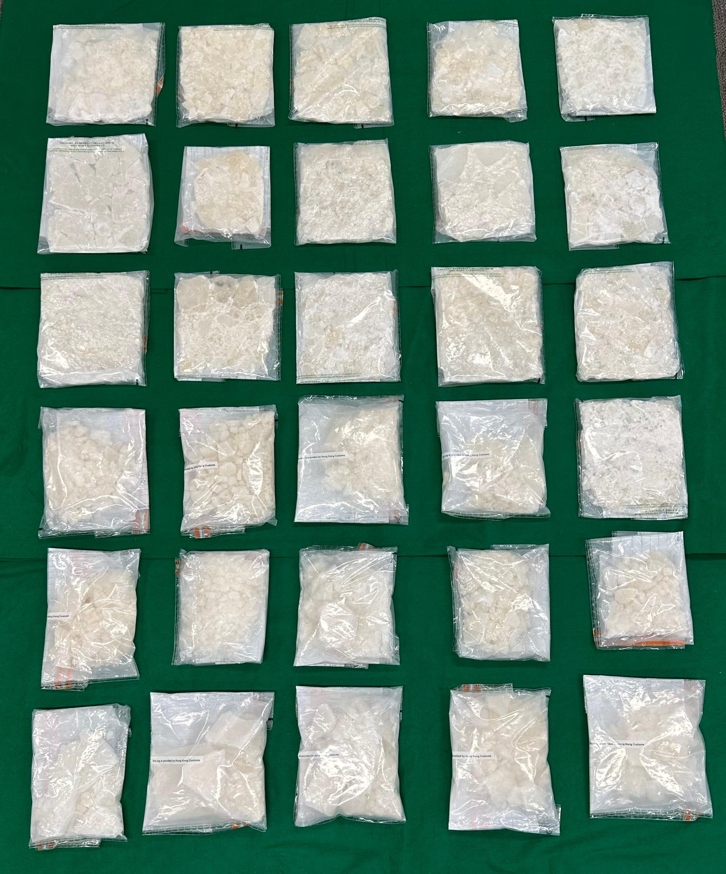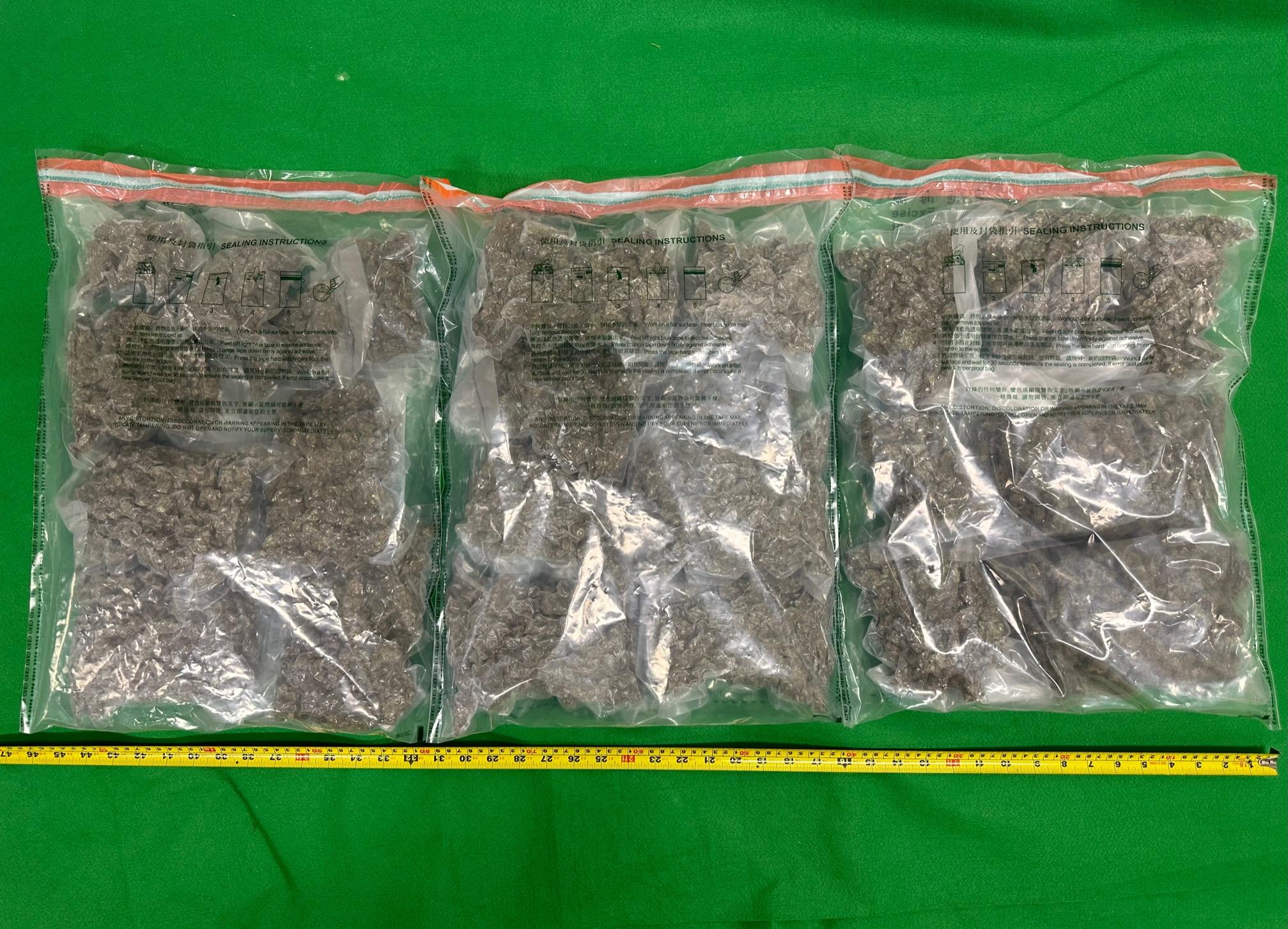 After a follow-up investigation, Customs officers conducted a controlled delivery operation in Yuen Long on June 19 and arrested three men, aged 30, 40 and 52, suspected to be connected with the case. The 30-year-old man and the 52-year-old man were each laid with a holding charge with one count of trafficking in a dangerous drug while the 40-year-old man has been released on bailing pending further investigation.