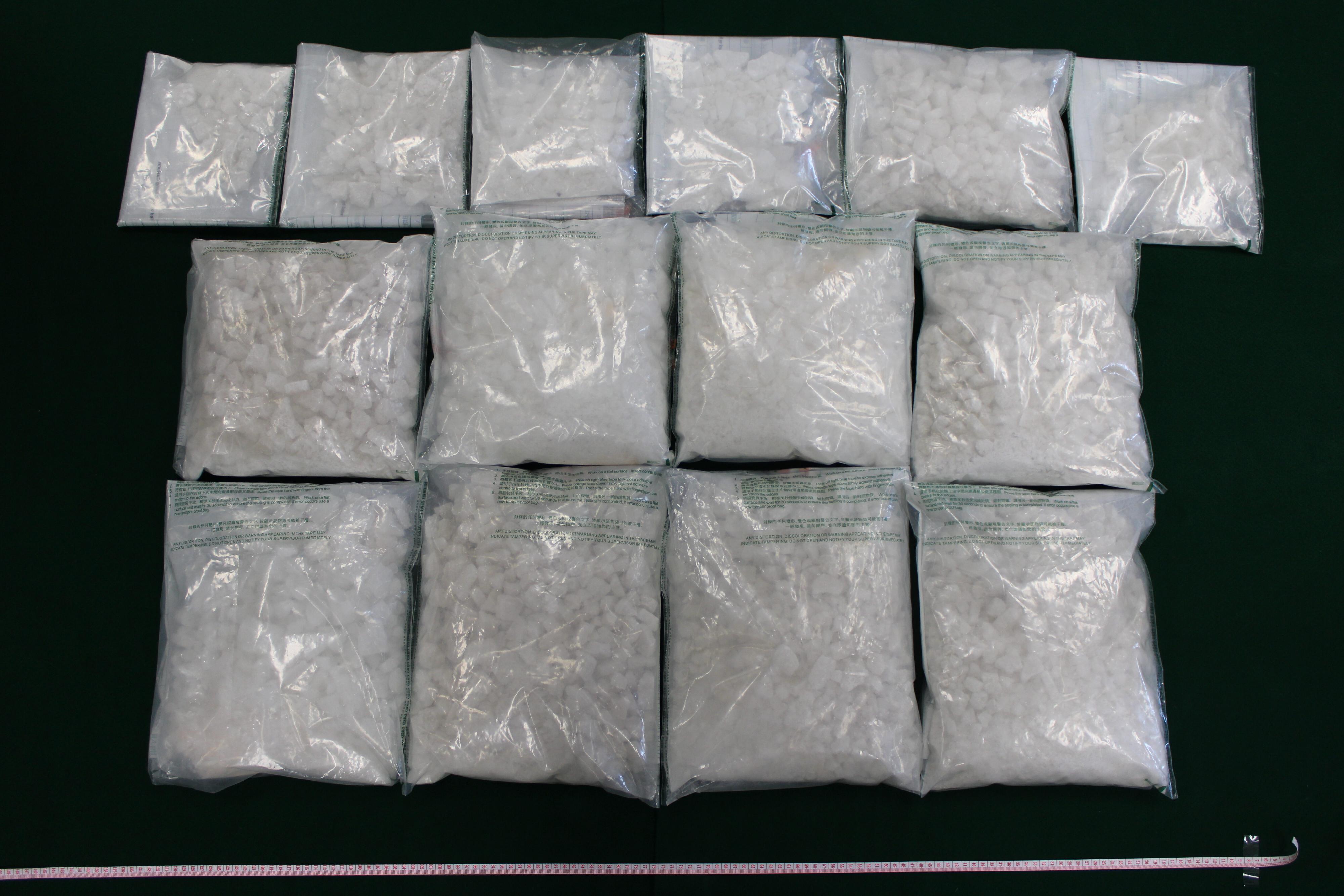 Customs on that day examined a batch of air cargo consignment, declared as carrying drive shafts, arriving in Hong Kong from Germany at the airport. Upon inspection, Customs officers found a total of about 30kg of suspected ketamine concealed inside 12 drive shafts. After a follow-up investigation, Customs officers yesterday (June 30) mounted a controlled delivery operation and arrested two men, aged 42 and 35, suspected to be connected with the case in Tuen Mun.