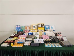 Customs earlier received information alleging the sale of suspected counterfeit beauty products and perfumes at several retail shops. After an in-depth investigation and with the assistance of the trademark owners, Customs officers took enforcement action and raided two retail shops in Sheung Shui on June 27 and July 4. The batch of suspected counterfeit goods, including cosmetics, skincare products, perfumes and medicines, was seized.