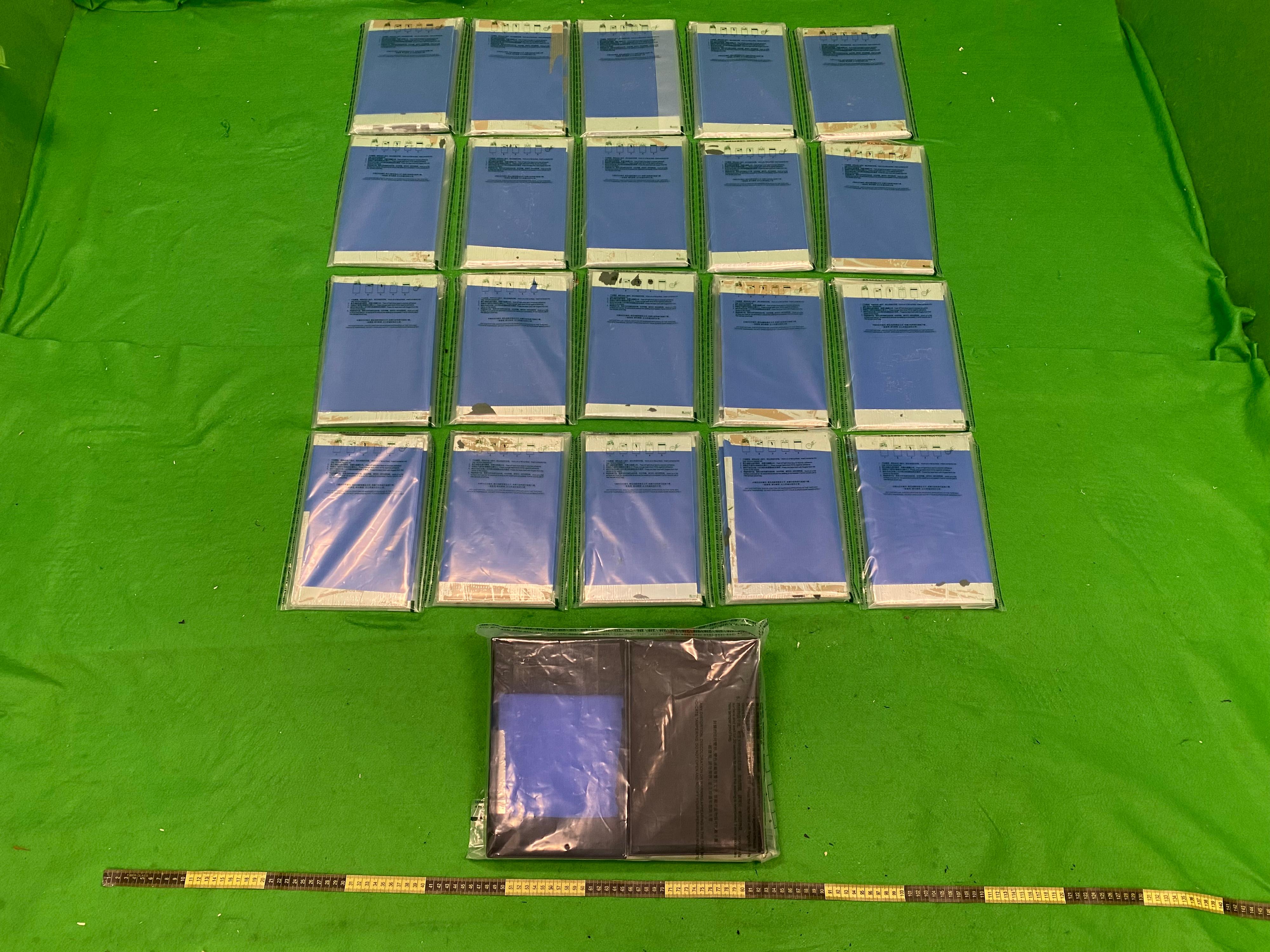 Through risk assessment, Customs on that day inspected an air parcel, declared as carrying clothes and arriving in Hong Kong from Germany, at the airport. Upon inspection, Customers officers found the batch of suspected ketamine between the interlayers of 21 paper boxes which contained clothes.