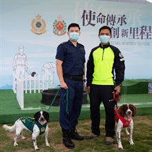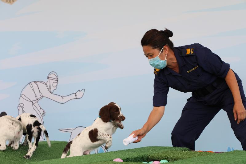 The Deputy Head of Land Boundary Command (Customs Canine Force), Ms Gladys Ma, said at a press conference today (April 23) that the co-operative canine breeding programme with the theme "Together, we incubate the future" symbolises the injection of new blood into the dog teams of both departments, and the inheritance of professionalism in Customs detector dogs' law enforcement and FSD rescue dogs' commitment to serve the community. Senior Station Officer (Technical Rescue) of the Fire and Ambulance Services Academy Mr Eric Law said that Customs and the FSD also shared the experience in canine breeding and training to help enhance the working efficiency of dog handlers and working dogs, which was beneficial to the development of the two working dog units.