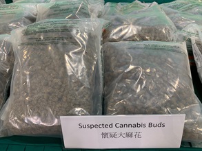 In one of the cases, Customs officers arrested a 17-year-old youth in Ho Man Tin while he collected two parcels containing a batch of snacks, in which about 7kg of suspected cannabis buds were concealed inside. In another case, Customs officers arrested a 64-year-old man in Tai Po while he collected a parcel containing a batch of gift boxes, in which about 5kg of suspected ketamine was concealed inside the false compartment of the boxes.