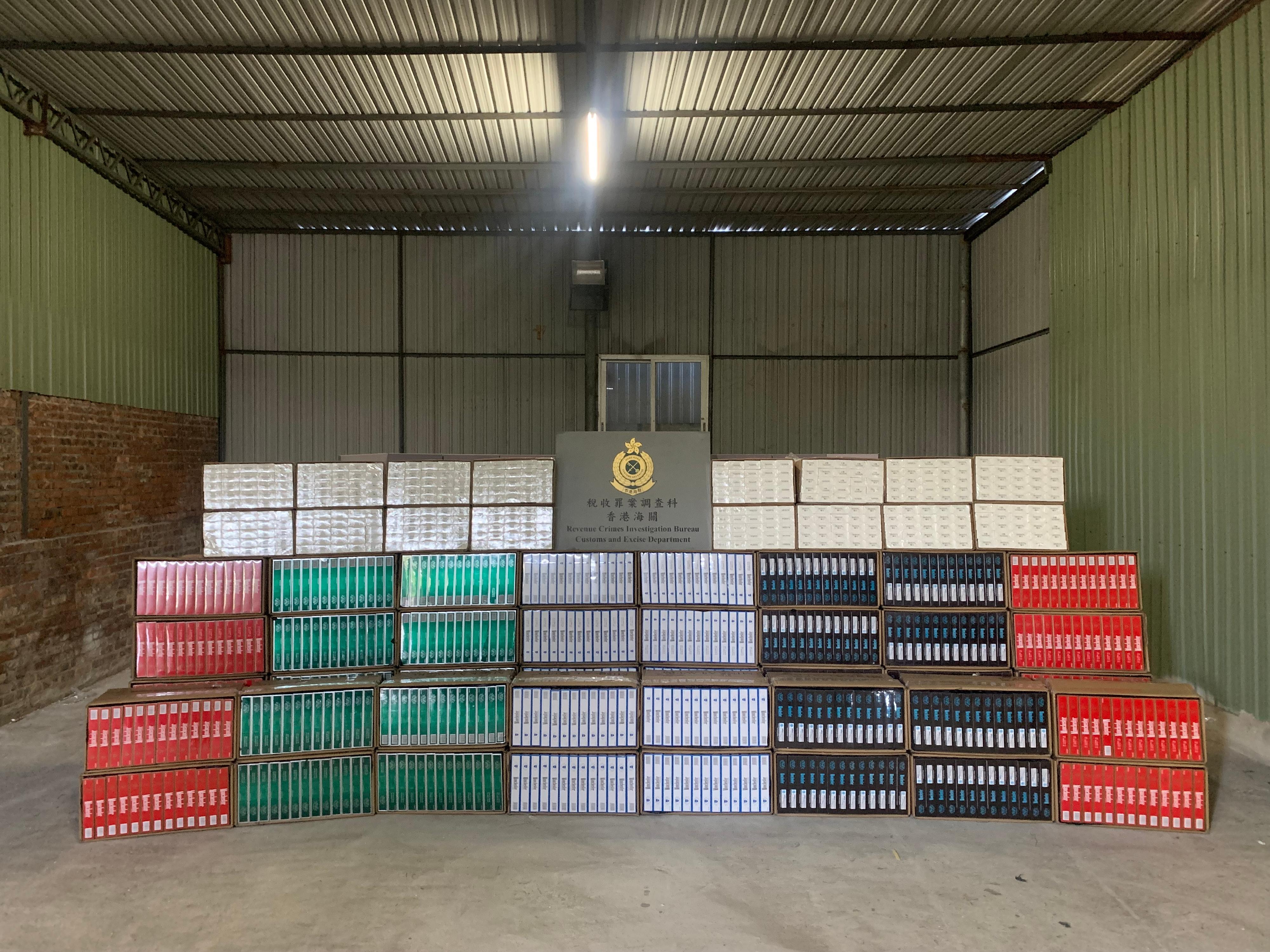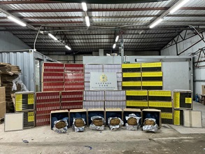 In the second case, Customs officers yesterday afternoon seized about 1.9 million suspected illicit cigarettes and about 130kg of suspected duty-not-paid manufactured tobacco inside a metal hut in Ha San Wai Tsuen, Tin Shui Wai, successfully smashing another suspected illicit cigarette storage centre. A 43-year-old man, who claimed to be a warehouse keeper and is suspected to be connected with the case, was arrested.