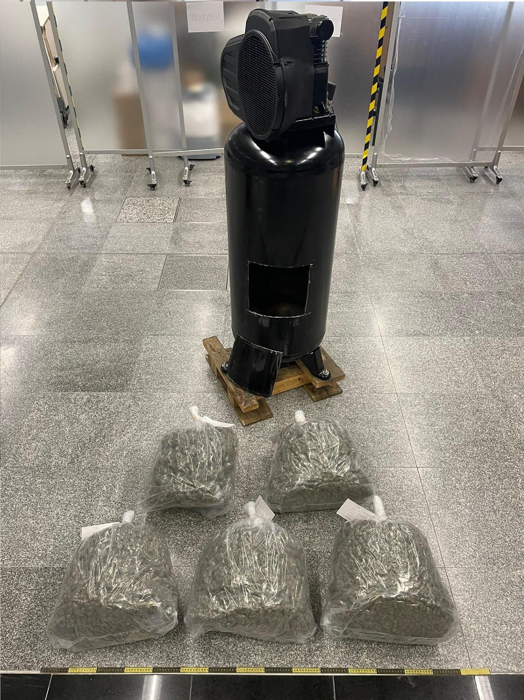 Through risk assessment, Customs on September 27 inspected an airborne consignment, declared as carrying compressors and arriving in Hong Kong from the United States, at the airport. Upon inspection, Customs officers found about 20kg of suspected cannabis buds inside a compressor.