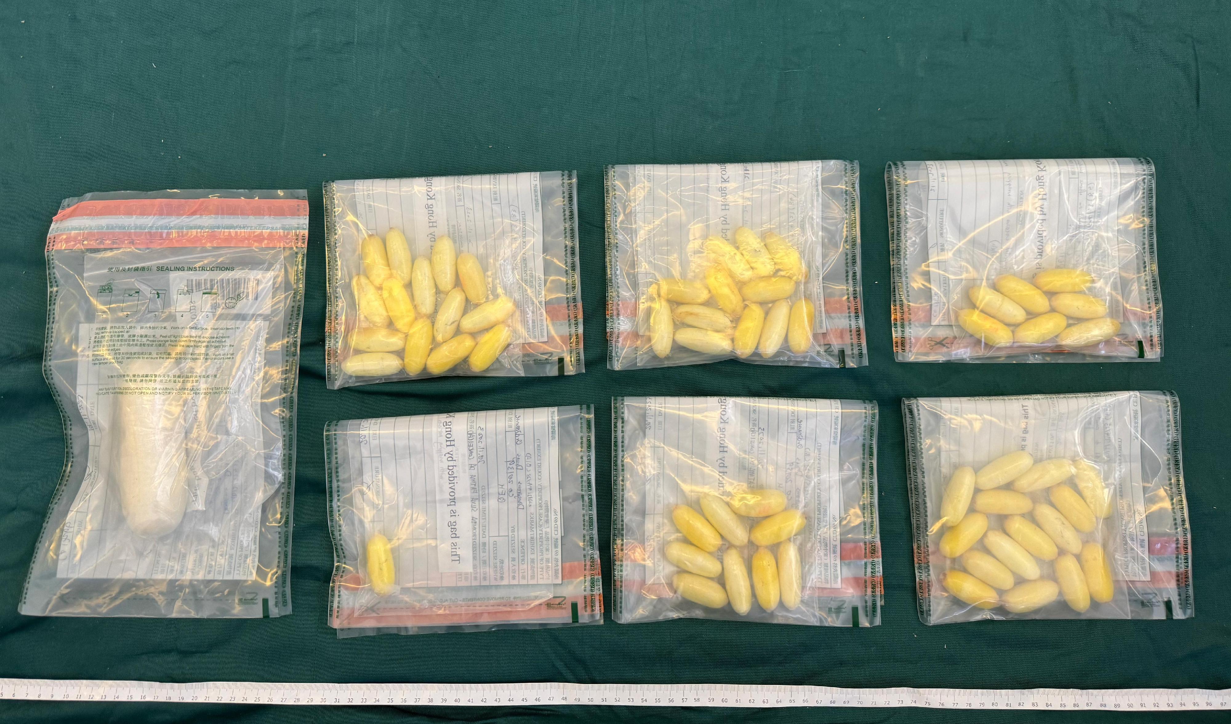 A female passenger, aged 39, arrived in Hong Kong from Paris, France, on that day. During Customs clearance, Customs officers suspected that the passenger had foreign objects concealed inside her body cavity. The woman was arrested immediately and then escorted to the hospital for examination.