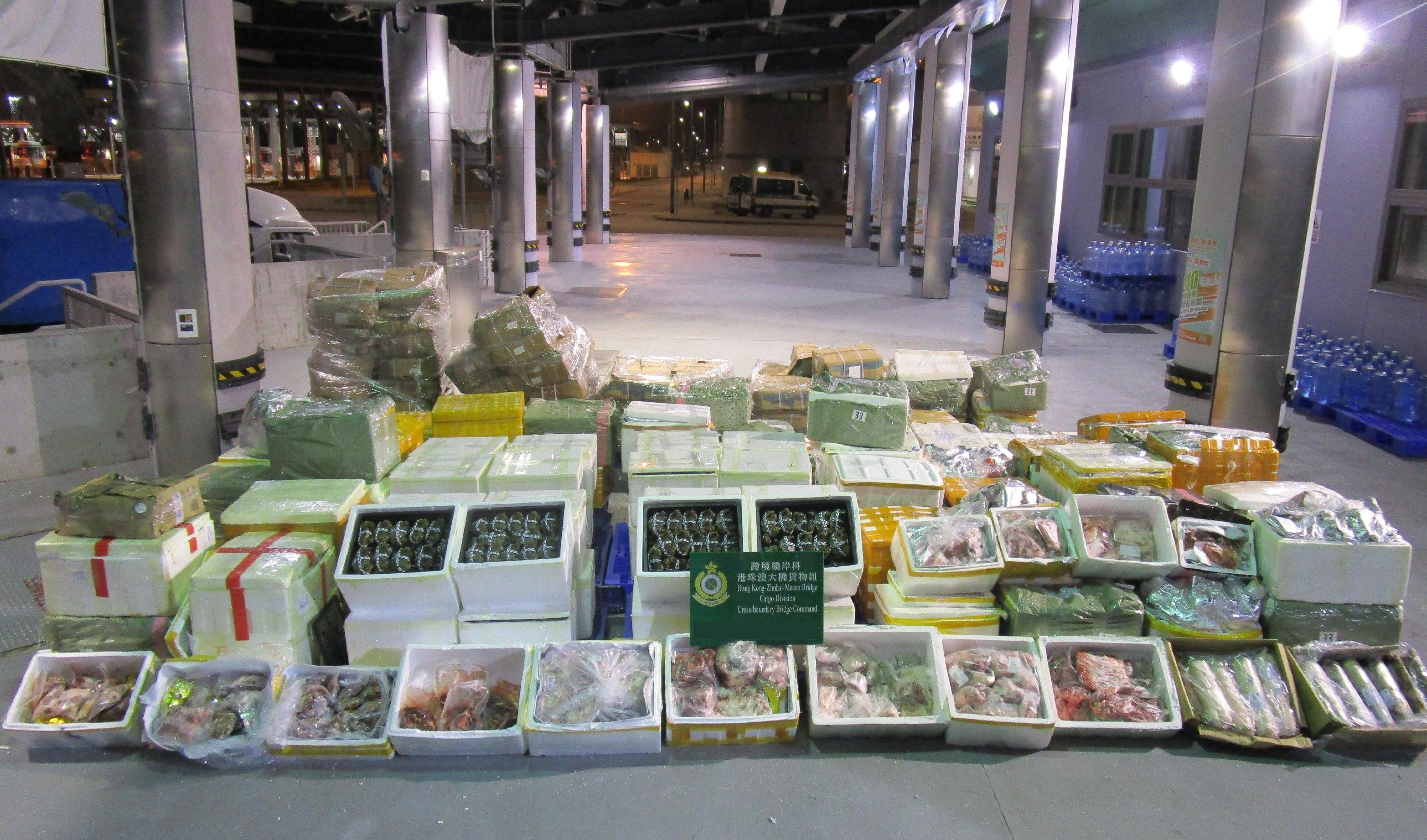 The Hong Kong Customs and Excise Department yesterday (November 24) seized about 1 800 suspected smuggled hairy crabs, weighing about 550 kilograms, and about 3 700 kg of meat and poultry, with an estimated market value of about $520,000 at the Hong Kong-Zhuhai-Macao Bridge Hong Kong Port.