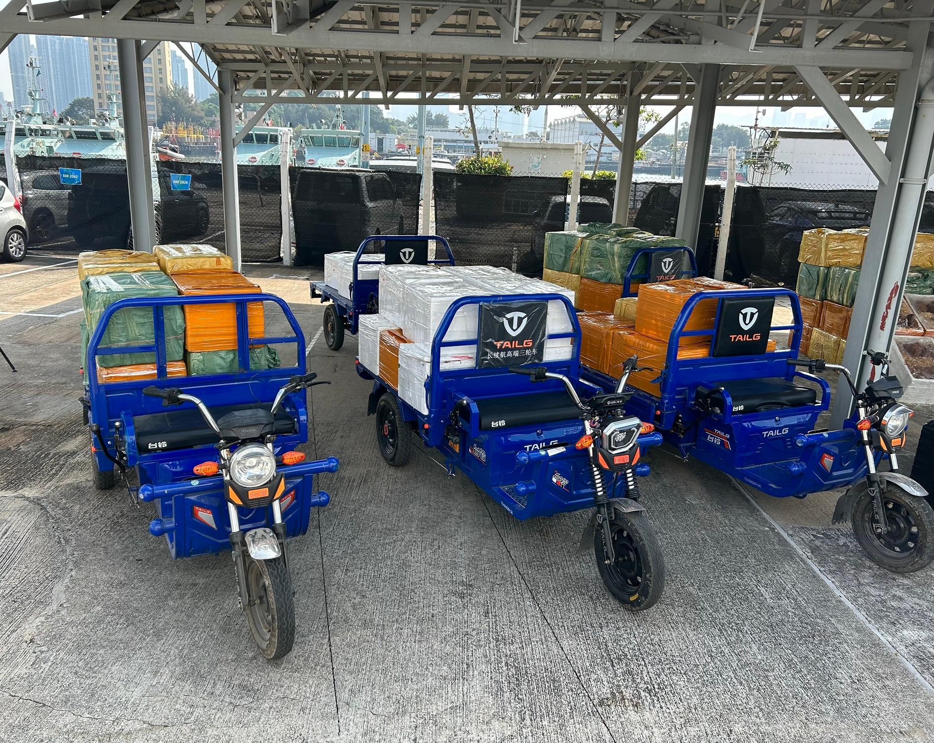 Customs officers yesterday conducted an anti-smuggling operation in the vicinity of Tai O and observed five electric tricycles loaded with goods moving slowly towards the seashore. Also, some men were seen gathering at the seashore. Later, two suspicious speedboats were seen heading towards the seashore with its navigation lights off, and two of the electric tricycles approached the seashore immediately. The drivers of the two tricycles and the above-mentioned persons quickly transferred the goods from the vehicles onto the speedboats, and were suspected of engaging in smuggling activities.