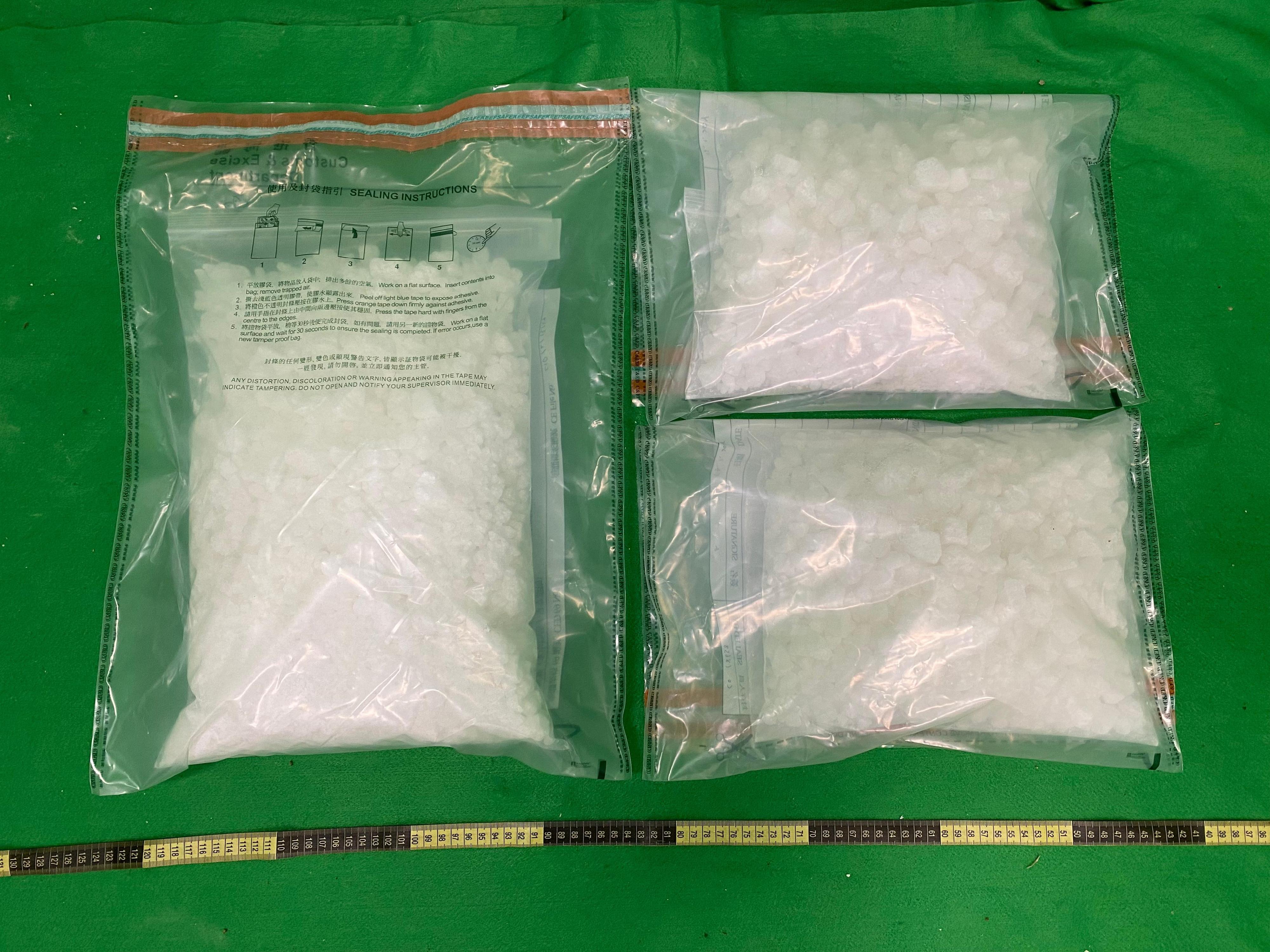Through risk assessment, Customs on that day inspected an air parcel, declared as carrying construction materials, at the airport. Upon inspection, Customs officers found the batch of suspected ketamine concealed inside three construction materials' packaging bags.