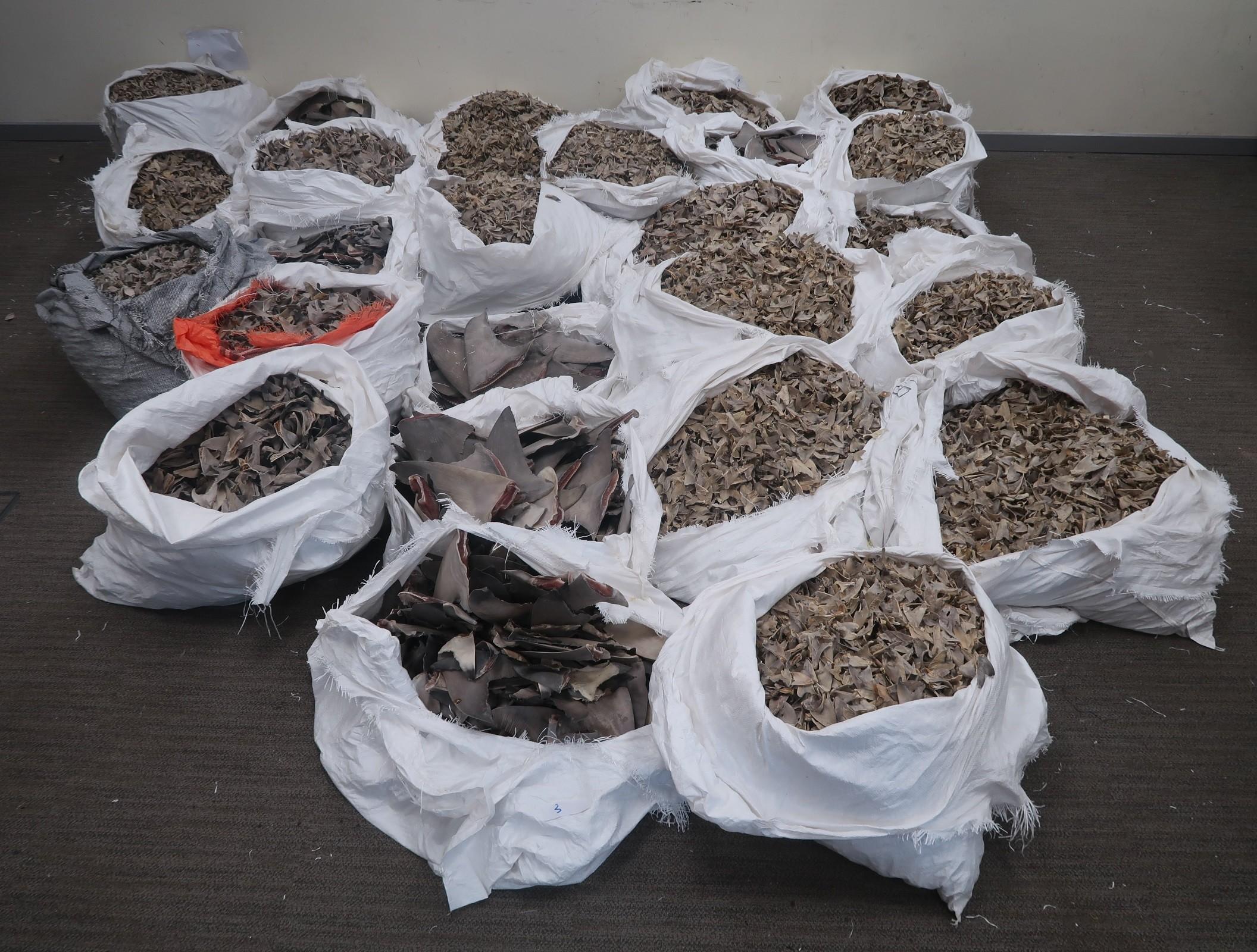 Through risk assessment, Customs officers yesterday inspected an air consignment, declared as dry fish, arriving in Hong Kong from Dubai at an air cargo terminal in the airport. Upon inspection, Customs officers found a total of about 800kg of suspected scheduled shark fins inside 25 carton boxes among the goods.