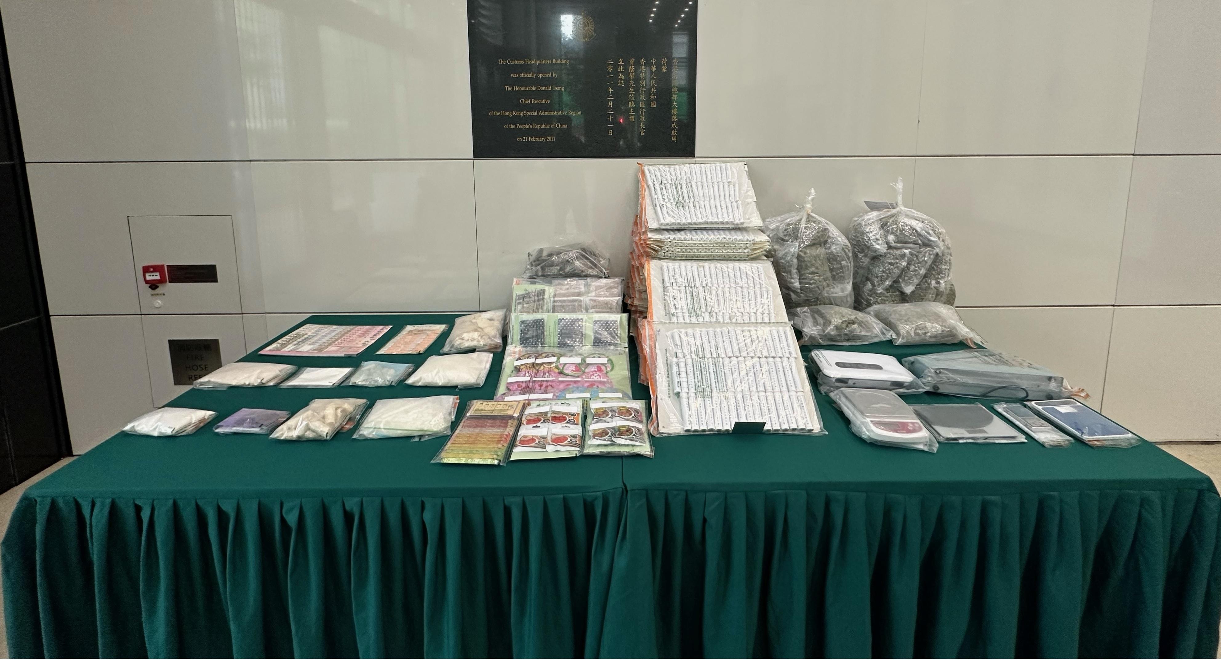 After a follow-up investigation, Customs yesterday escorted the arrested man to a residence in Yuen Long for a search. Inside the premises, Customs officers seized about 3kg of suspected cannabis resin, about 2.3kg of suspected methamphetamine, about 480 grams of suspected ketamine, about 3kg of assorted drugs and a batch of drug packaging paraphernalia.