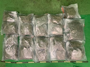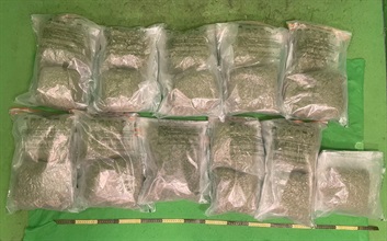 Yesterday, Customs intercepted a 18-year-old male passenger and a 42-year-old female passenger, both arrived in Hong Kong from Bangkok, Thailand, at the airport. During customs clearance, about 10kg of suspected cannabis buds were found in each of their checked-in luggage. The duo were subsequently arrested.