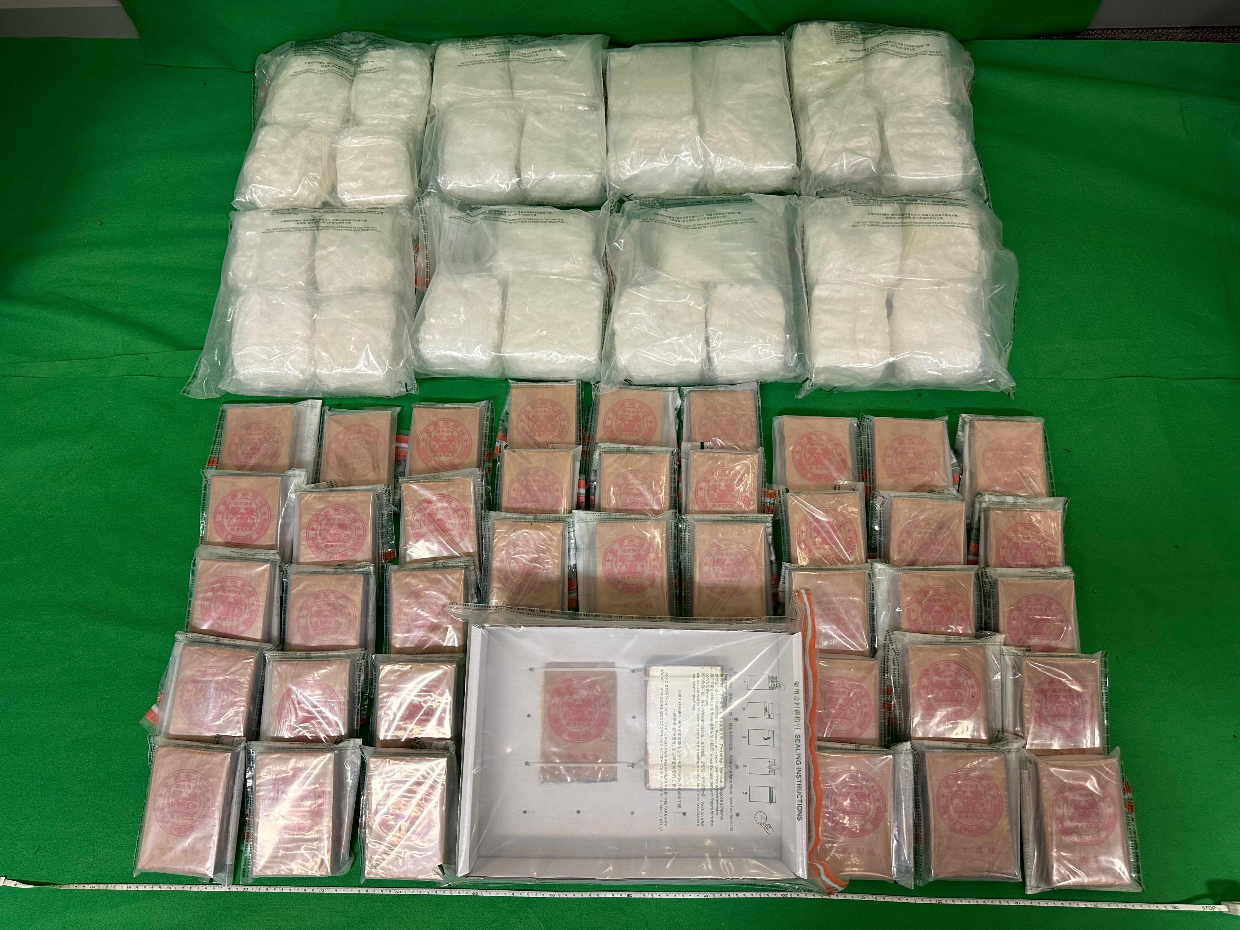 The second case involved three male passengers, aged 29, 33 and 34, who arrived in Hong Kong from Bangkok, Thailand, yesterday. During customs clearance, Customs officers seized a total of about 32kg of suspected methamphetamine and 15kg of suspected heroin in their check-in luggage. They were subsequently arrested.