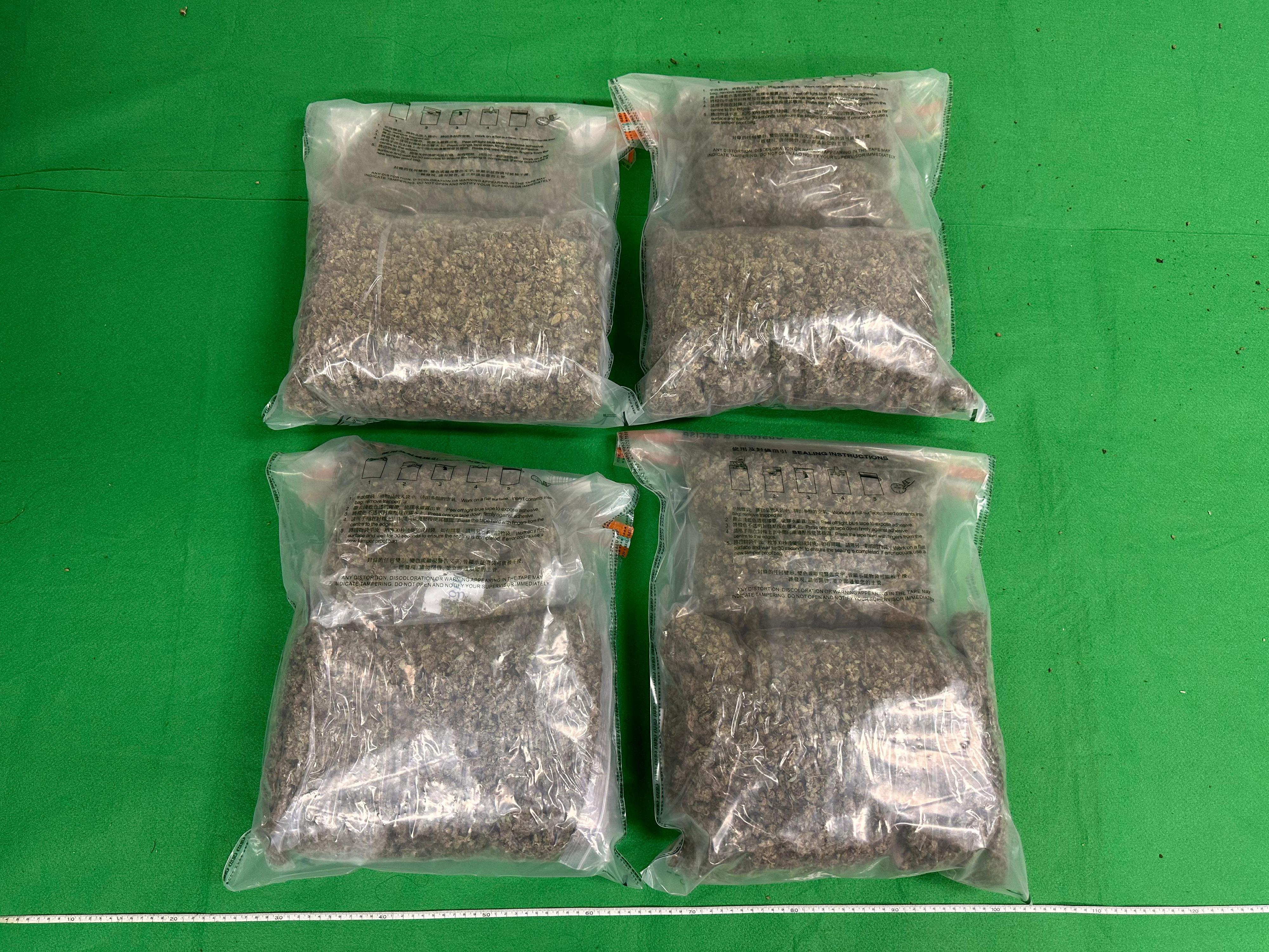 The third case involved a 35-year-old male passenger who arrived in Hong Kong from Bangkok, Thailand, yesterday. During customs clearance, Customs officers found 4kg of suspected cannabis buds in his check-in baggage. He was subsequently arrested.