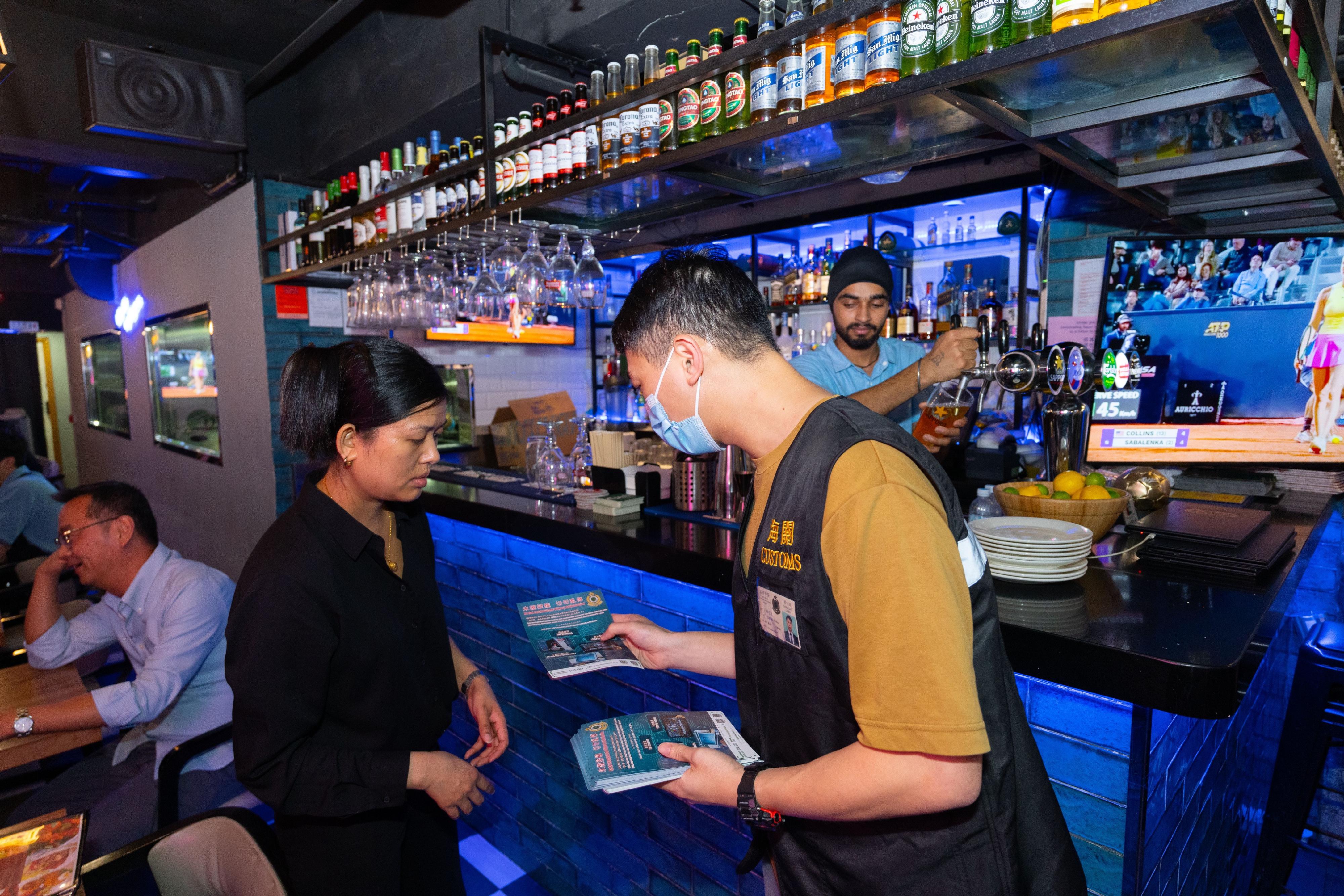 In view of the commencement of a number of international sports events since June, Hong Kong Customs from today (June 13) will launch a high-profile seven-day patrol operation and deploy officers to various districts across the territory including Sham Shui Po, Yau Tsim Mong, Wan Chai, Kwun Tong, Tuen Mun, Yuen Long, Tai Po, Sheung Shui, and Islands District to conduct anti-infringement activities inspections. Customs will also take the opportunity to distribute promotional leaflets to stores, bars and restaurants, and explain the relevant legal requirements to the merchants to prevent them from violating the laws unwittingly.