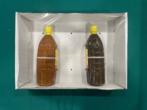 Through risk assessment, Customs on that day searched a warehouse in Fanling. Among 60 boxes of chili sauce inside the warehouse, 22 of them were found concealed with a total of 264 bottles of suspected liquid methamphetamine disguised in chili sauce packaging. Each bottle of the drugs weighed about 1kg, the total weight of the seizure was about 264kg and the estimated market value was of about $140 million. A batch of suspected chemicals and suspected drug paraphernalia were also seized at the scene.