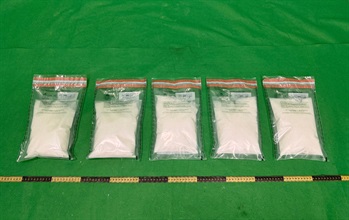 A 64-year-old male passenger arrived in Hong Kong from Amsterdam, the Netherlands, via Helsinki, Finland, on that day. During Customs clearance, about 3.3kg of suspected ketamine were found concealed in five health supplements packaging in his check-in luggage. The man was subsequently arrested.