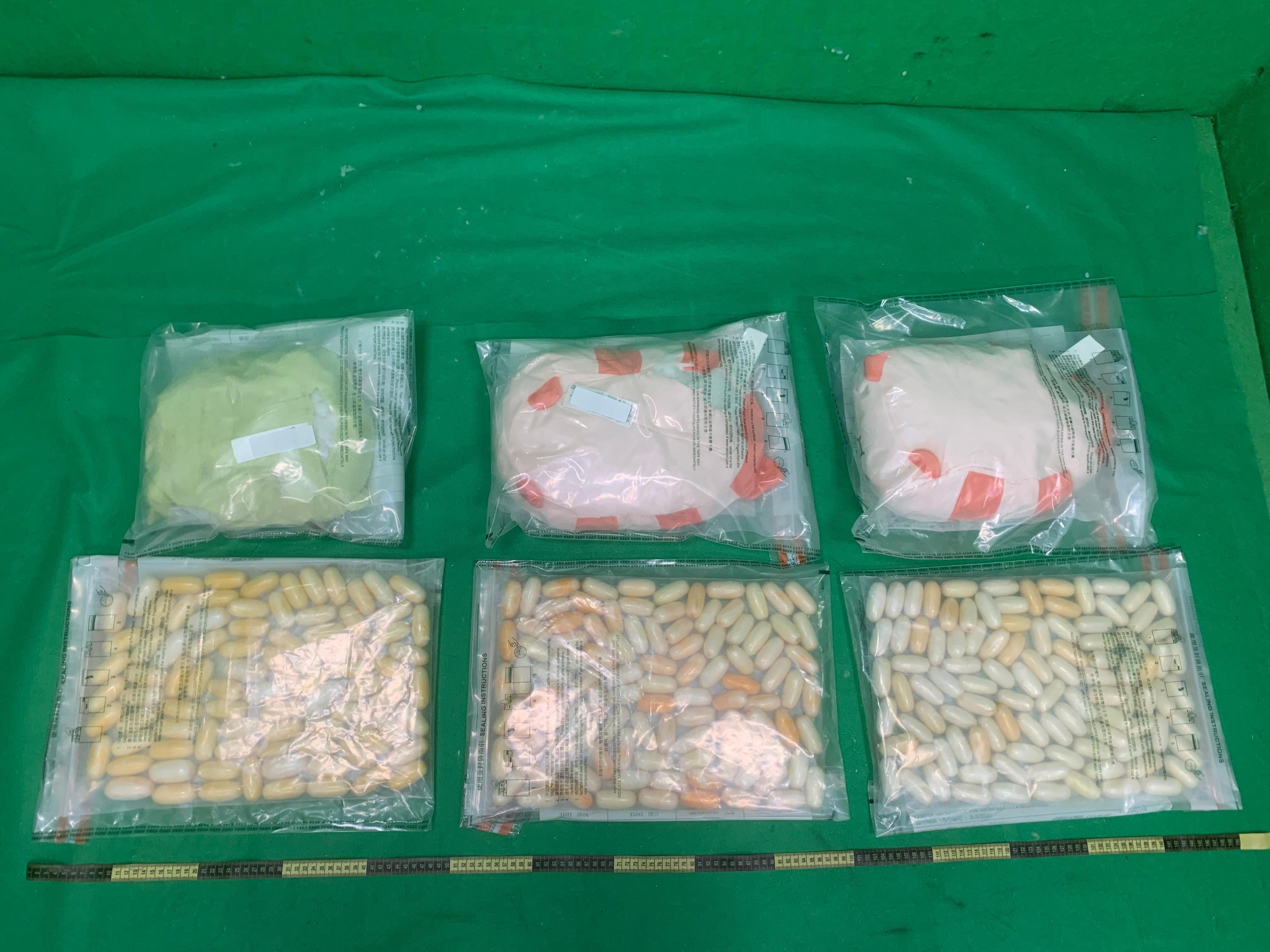 A 68-year-old female passenger departed from Warsaw, Poland, on August 7 and transited via Dubai of United Arab Emirates, Doha of Qatar and Hanoi of Vietnam before arriving in Hong Kong yesterday. During Customs clearance, Customs officers found a total of about 6.5kg of suspected cocaine concealed inside three stuffed toys in her carry-on suitcase. The woman was subsequently arrested.