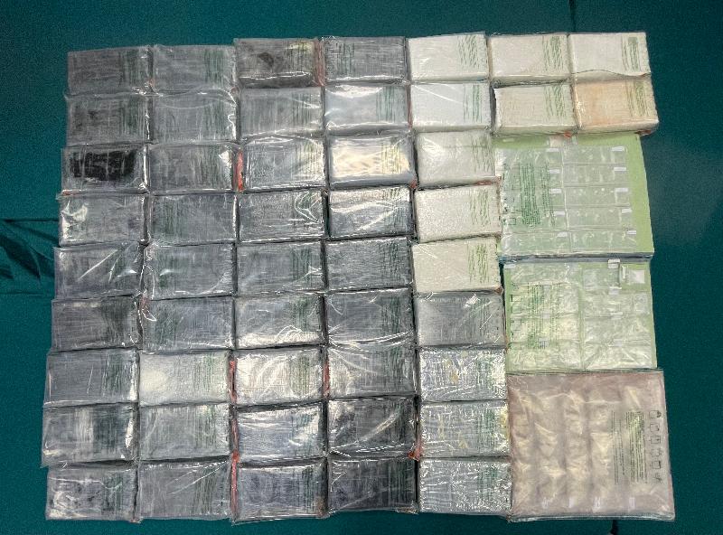 Customs officers then escorted the arrested man to a residential premises in the district. About 52kg of suspected cocaine and about 620g of suspected crack cocaine were found inside a safe. A small amount of suspected crack cocaine along with a batch of drug manufacturing and packaging paraphernalia were also found at other places in the premises.