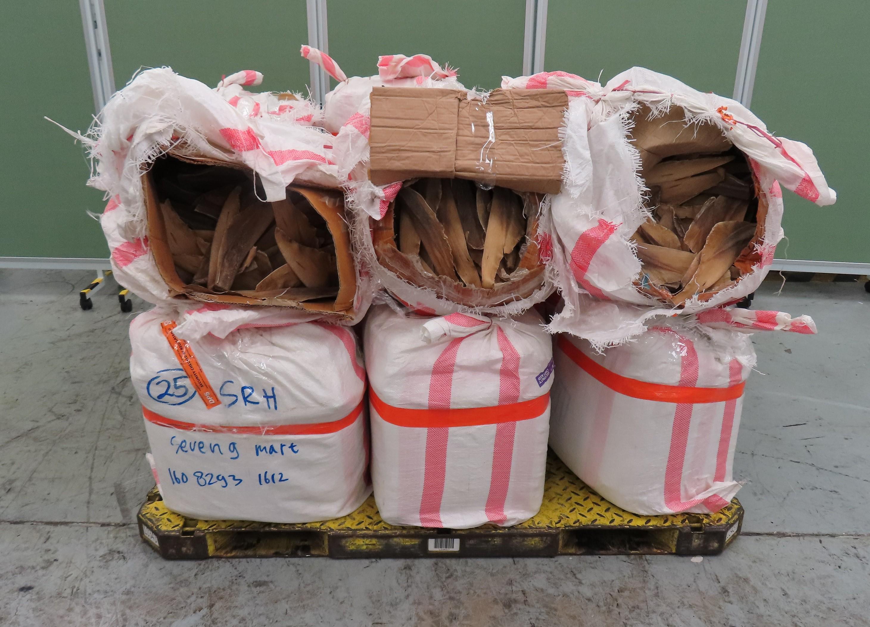 Through risk assessment, Customs officers inspected an air consignment, declared as carrying household goods and arriving in Hong Kong from Indonesia, on that day. Upon inspection, the batch of dried shark fins, sea cucumbers and proprietary Chinese medicine suspected to be scheduled under the Protection of Endangered Species of Animals and Plants Ordinance (Ordinance) (Cap. 586), was found inside 33 carton boxes.