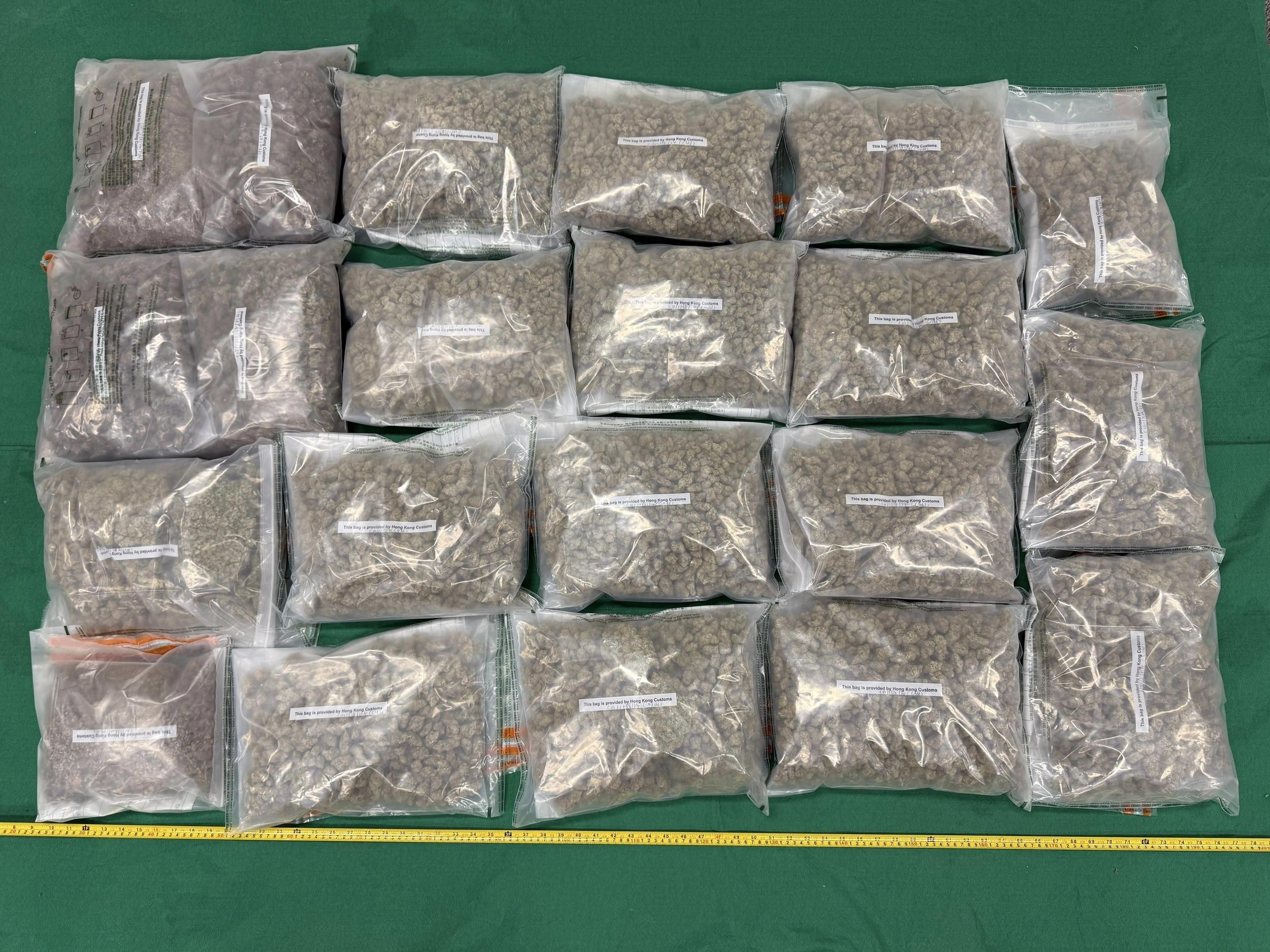 In the second case, during an anti-narcotics operation conducted in the vicinity of Fanling yesterday afternoon, Customs intercepted a 28-year-old man and found about 1.5kg of suspected cannabis buds inside two recycle bags carried by him. He was then arrested. Customs officers later further seized about 15kg of suspected cannabis buds from his private vehicle parked nearby. Upon a follow-up investigation, the man was brought to a village house rented by him in Tai Po for a search, and about 3.5kg of suspected cannabis buds and a batch of drug packaging paraphernalia were uncovered. About 20kg of suspected cannabis buds in total were seized in the operation.