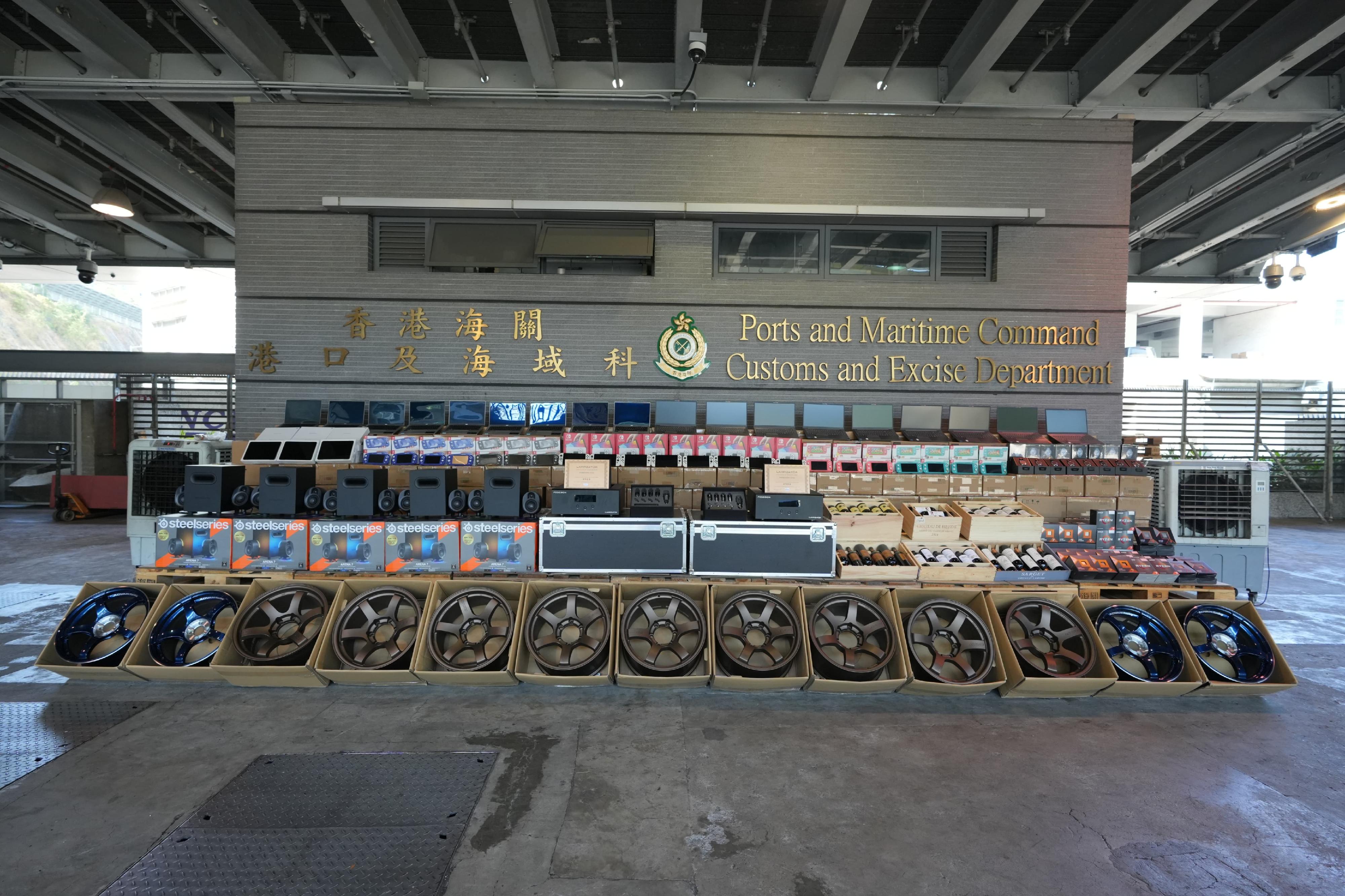 On September 26, Customs officers identified an ocean-going vessel preparing to depart from Hong Kong for the Philippines for inspection and seized a large batch of suspected smuggled items, including new tyre rims, red wine, game consoles, CPUs and electronic products inside two containers which were declared as carrying plastic protective travelling cases and plastic tableware respectively aboard the vessel.