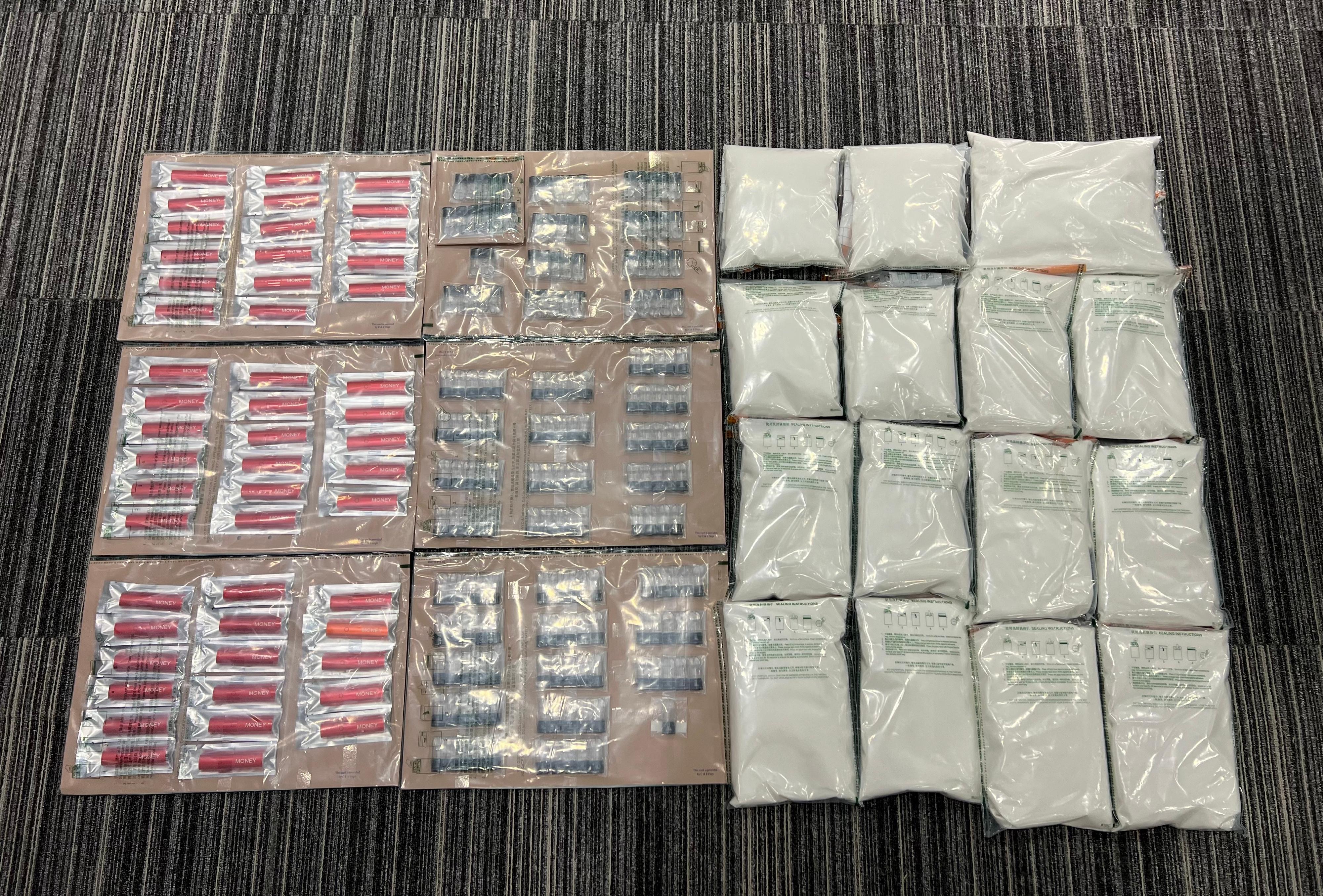 Based on risk assessment, Customs inspected eight express parcels, arriving from India to Hong Kong and declared as carrying Carbomer, at Hong Kong International Airport. After examination, 16kg of etomidate powder was seized from the parcels. Upon follow-up investigations, Customs conducted controlled delivery operations and arrested three parcel consignees. Also, two etomidate storage centres were shut down.