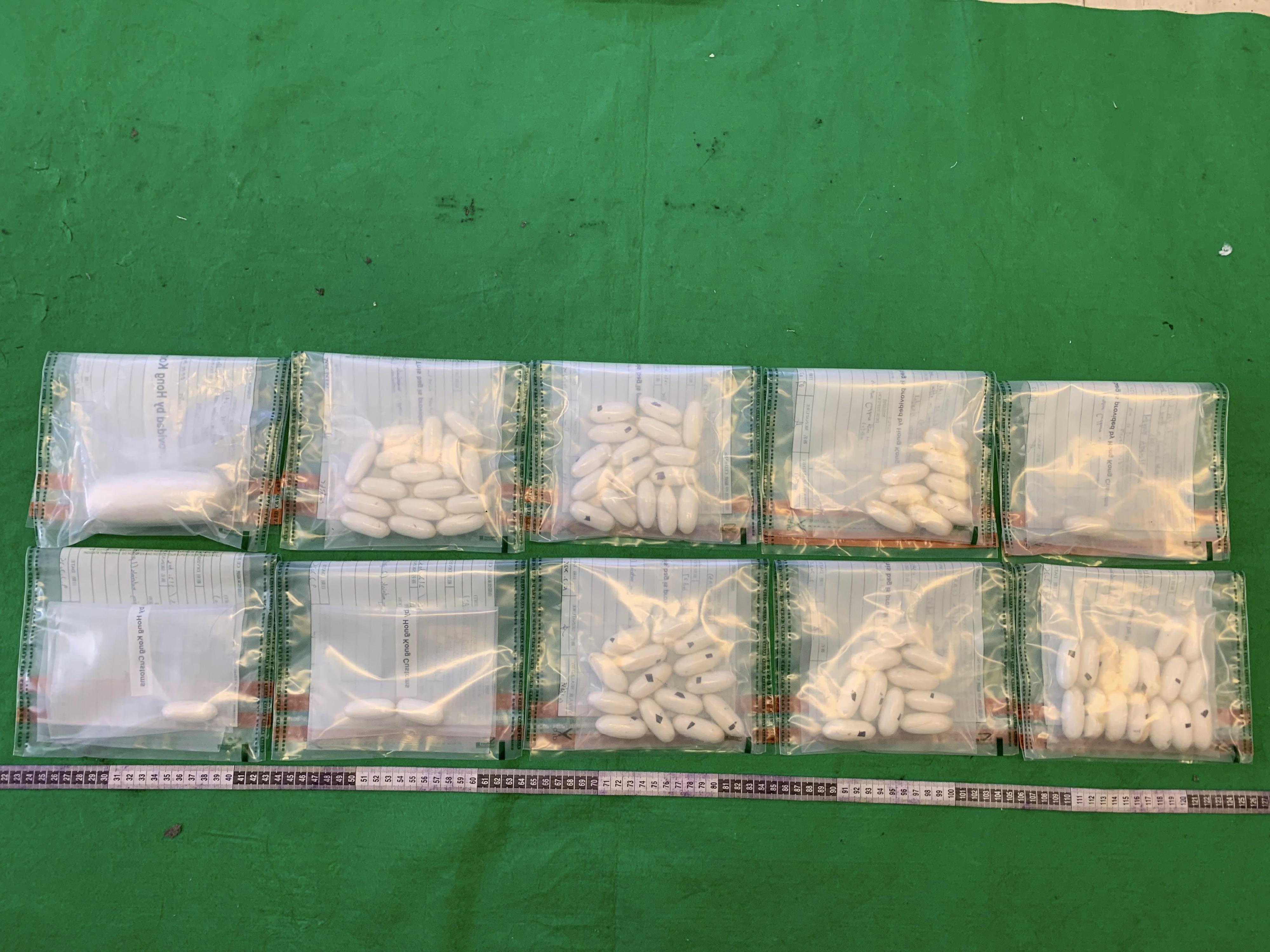Customs officers on that day intercepted a male passenger and a female passenger, both aged 32, arriving in Hong Kong from Budapest, Hungary, via Paris, France, and Zurich, Switzerland. During Customs clearance, Customs officers suspected that the passengers had dangerous drugs concealed inside their body cavities. They were then escorted to the hospital for examination. Upon examination, doctors confirmed that foreign objects were concealed inside their body cavities, and they were arrested immediately. As at 4pm today (February 10), the arrested persons have discharged a total of 85 pellets of suspected cocaine weighing about 890g in total.