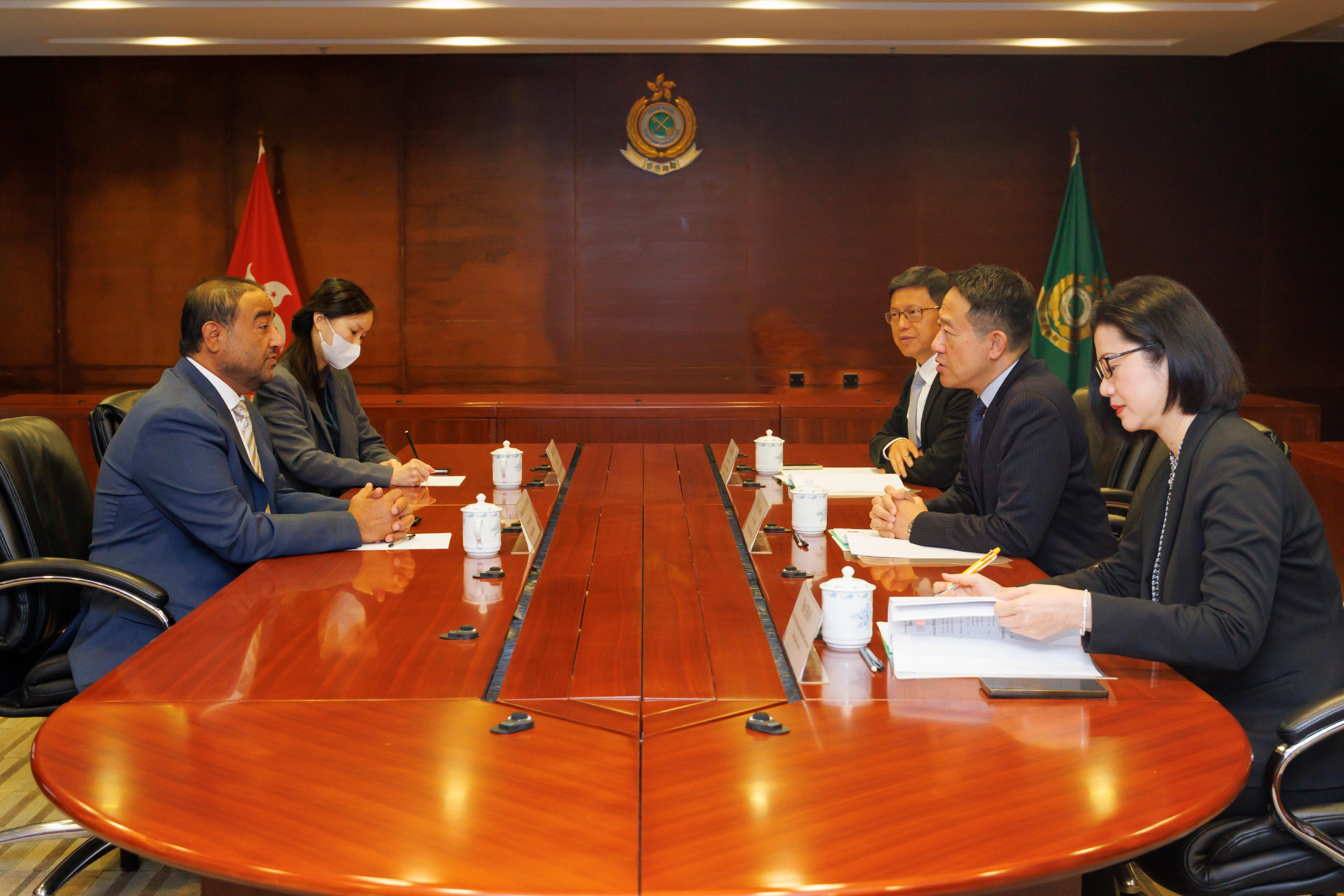 The Commissioner of Customs and Excise, Mr Chan Tsz-tat, today (February 21) held a courtesy meeting with the Director-General of Abu Dhabi Customs of the United Arab Emirates (UAE), Mr Rashed Lahej Al Mansoori, in the Customs Headquarters Building. The visit aimed to forge closer ties and strengthen business connections between the two sides.