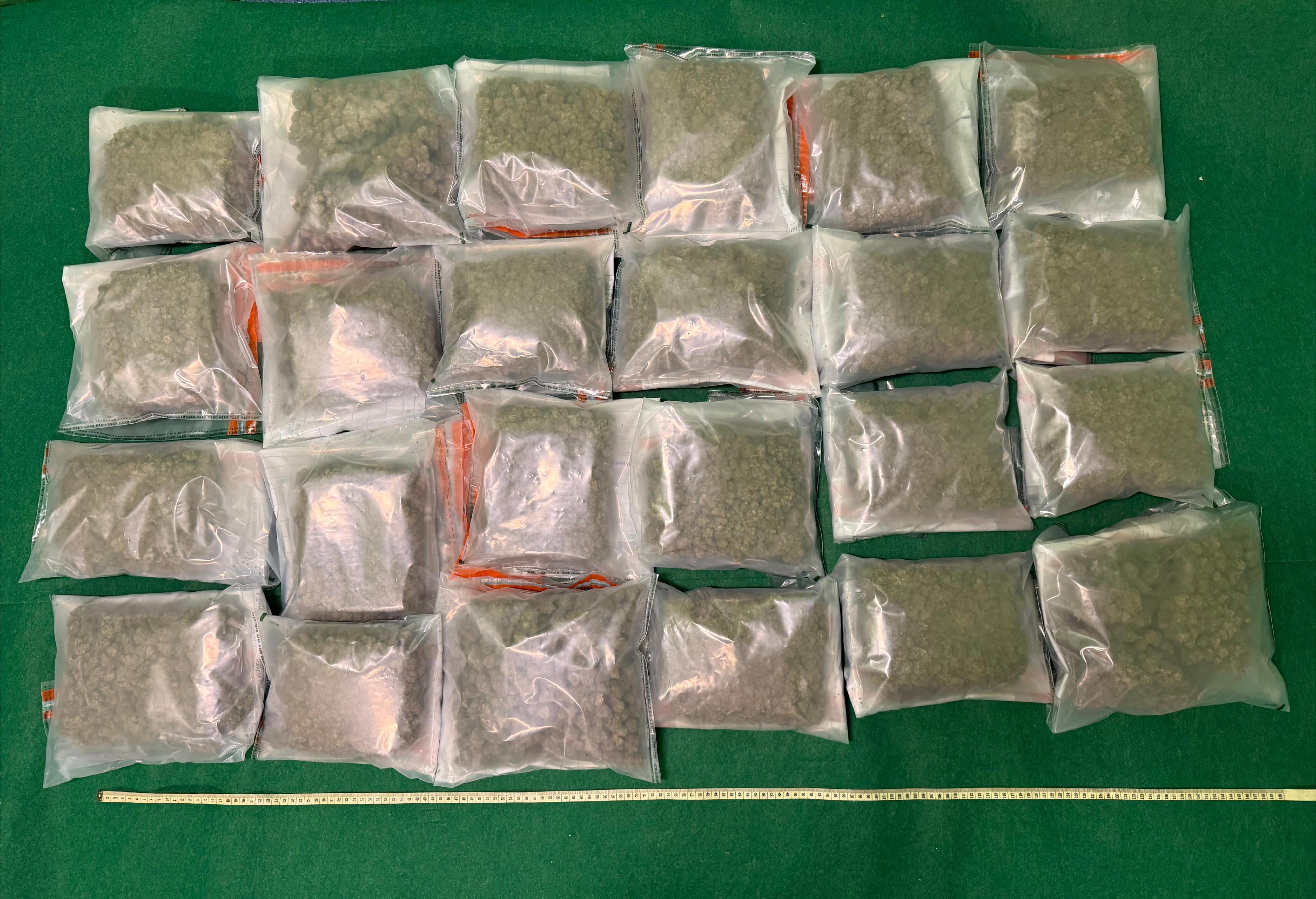A 27-year-old foreign male passenger arrived in Hong Kong from Bangkok, Thailand yesterday. During customs clearance, the suspected cannabis buds weighing about 13kg in total were found in 24 bags inside his check-in suitcase. The man was subsequently arrested.
