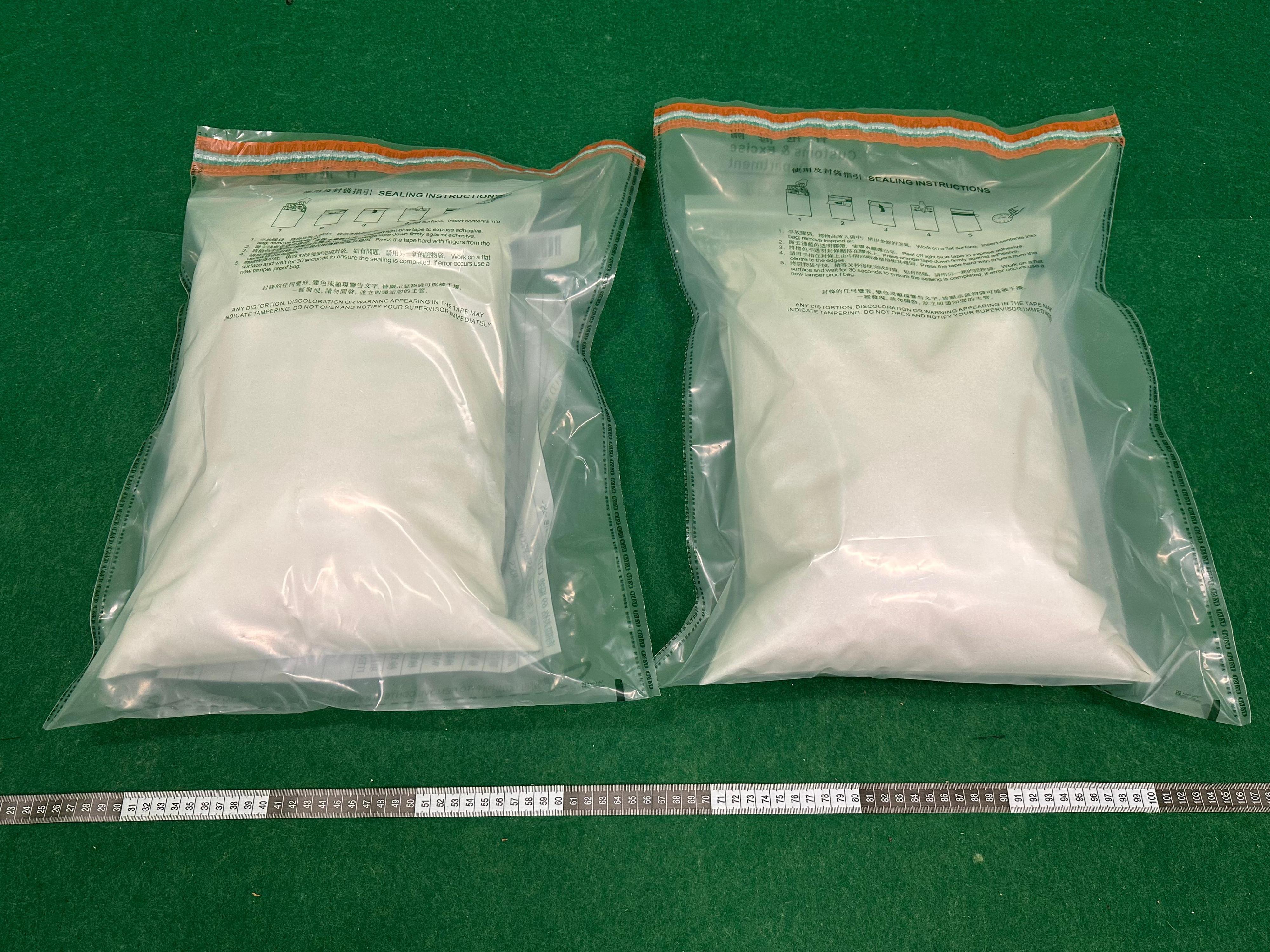 A male passenger, aged 18, arrived in Hong Kong from Brussels, Belgium via Dubai, the United Arab Emirates yesterday. During Customs clearance, Customs officers found about 13 kg of suspected ketamine in his check-in suitcase and 69 sticks of illicit cigarette from his carry-on bag. The man was subsequently arrested.