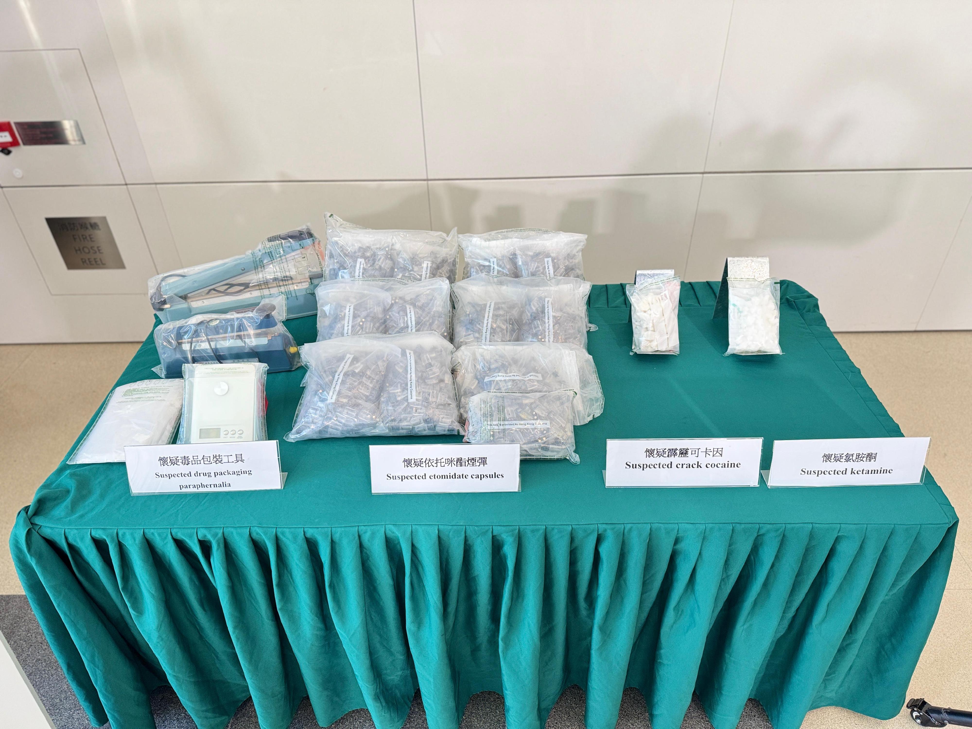 Hong Kong Customs yesterday (August 21) raided a suspected drug storage centre in Yuen Long and seized 3,405 suspected etomidate capsules, about 250 grams of suspected ketamine and about 300g of suspected crack cocaine with a total estimated market value of about $1.4 million. Two men aged 30 and 38 were arrested.