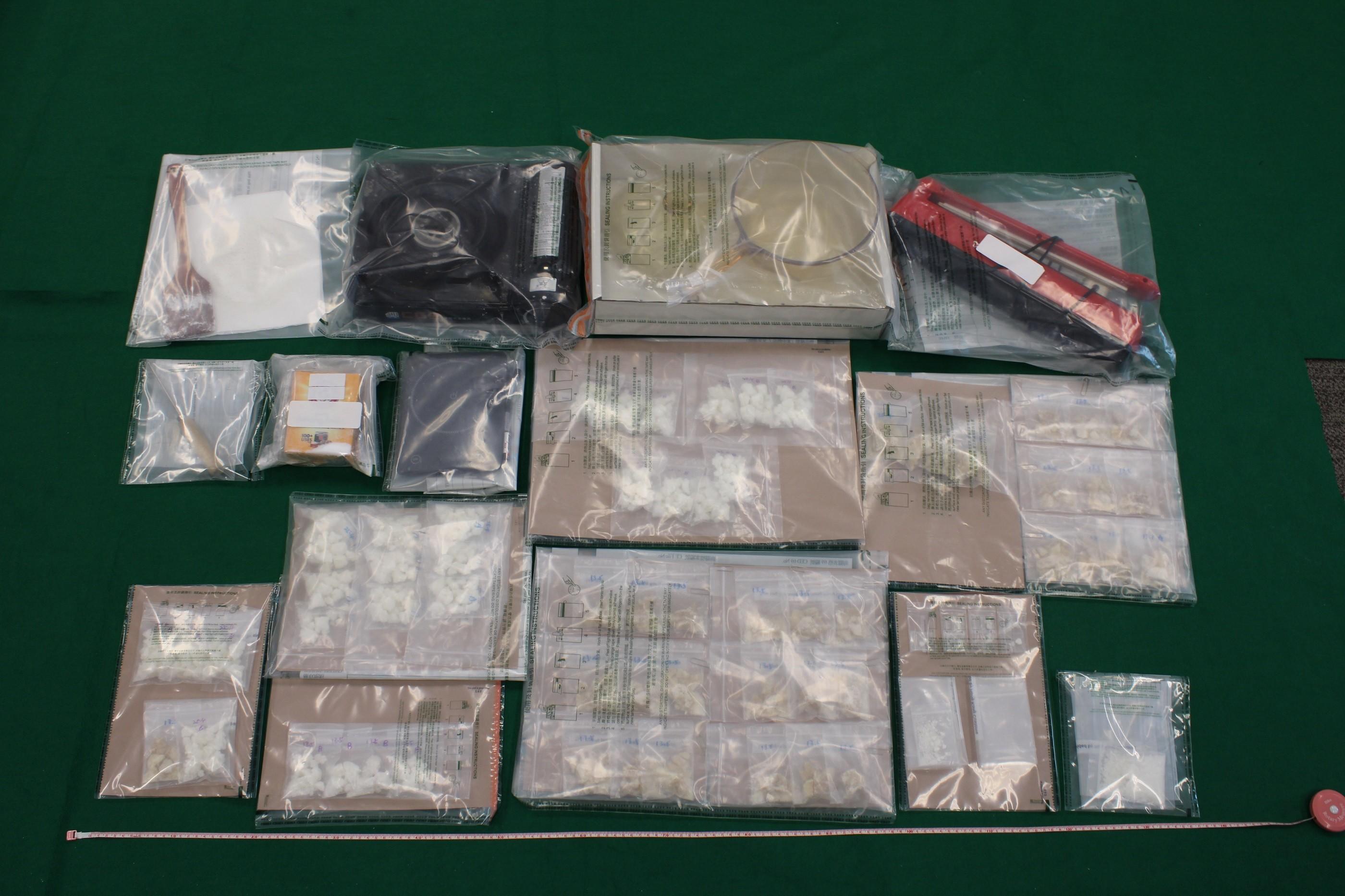 In the first case, during an anti-narcotics operation conducted in Tuen Mun yesterday evening, Customs officers intercepted a 51-year-old local man and seized about 1.17kg of suspected crack cocaine inside a paper bag carried by him. The man was subsequently arrested. Customs officers later escorted him to a residential unit nearby for a search and further seized about 30 grams of suspected crack cocaine and a batch of suspected drug manufacturing and packaging paraphernalia. The estimated market value of the drug was about $1.2 million.