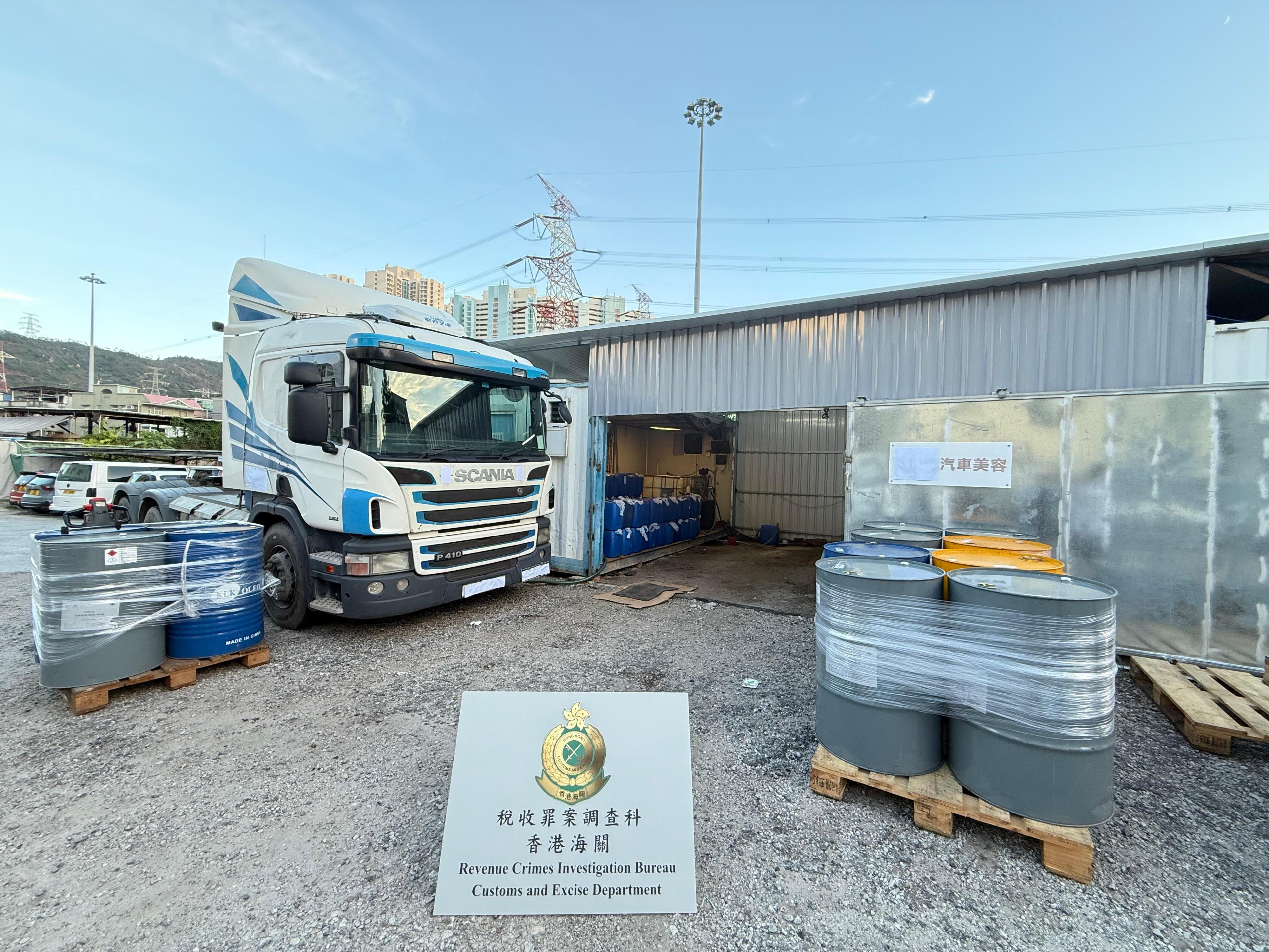 In addition, during the operation in downtown on September 17, Customs officers cracked down on a mobile illicit fueling station in a public car park in Tai Wai with 735 litres of illicit motor spirit and a batch of fueling equipment seized. A 31-year-old woman, believed to be the operator of the illegal fueling station, and a 44-year-old man who was coming for fueling, were arrested. Two private vehicles involved in the case were also detained. Moreover, Customs officers today (September 26) intercepted a suspicious lorry tractor parked at To Yuen Wai, Tuen Mun, with a hose connected from the vehicle into a nearby tin-sheet structure. Upon inspection, officers discovered the hose was linked to an oil tank inside the premises. Investigation revealed that the site was an illicit fuel storage and illicit fueling station. Approximately 2 450 litres of illicit motor spirit and a batch of fueling equipment were seized. A 48-year-old woman, believed to be the operator of the illegal fueling station, and a 58-year-old male lorry driver were arrested. The lorry tractor was also detained.