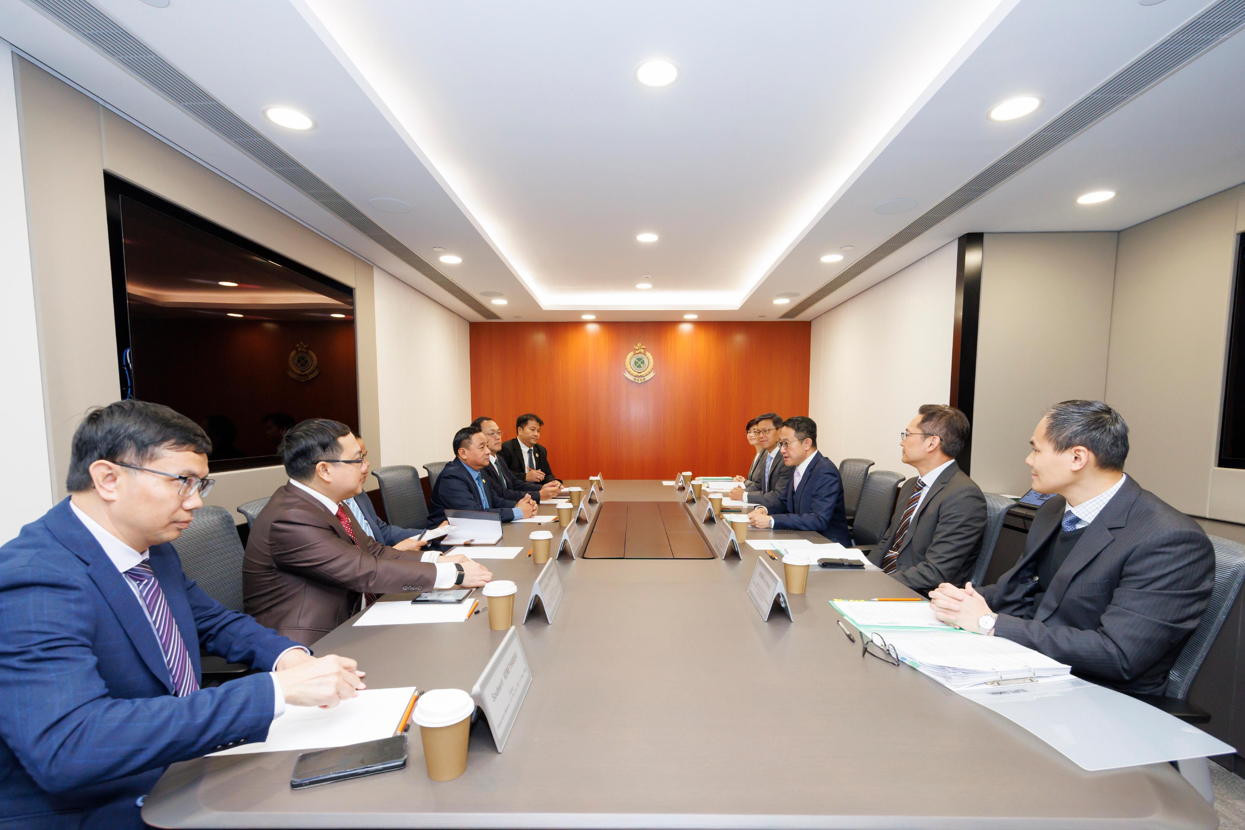 The Commissioner of Customs and Excise, Mr Chan Tsz-tat, today (March 10) met with the Director-General of the Lao Customs Department, Mr Phoukhaokham Vannavongxay, and a delegation, at the Customs Headquarters Building. The meeting aimed to strengthen collaboration on customs affairs and forge closer ties between the two administrations.