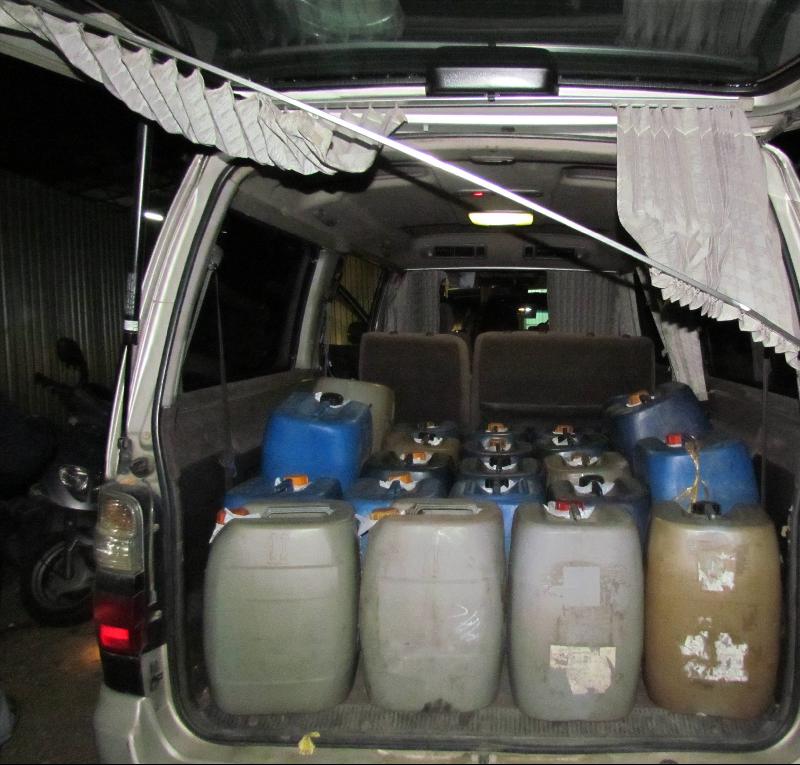 Acting on intelligence, Customs officers yesterday conducted an operation in Fung Kat Heung, Yuen Long, and successfully intercepted a light goods vehicle carrying 600 litres of illicit motor spirit and 3,200 illicit cigarettes. Upon follow-up investigation at a metal hut nearby, another 1,900 litres of illicit motor spirit and 160,000 illicit cigarettes were seized. An underground fuel tank was also found.